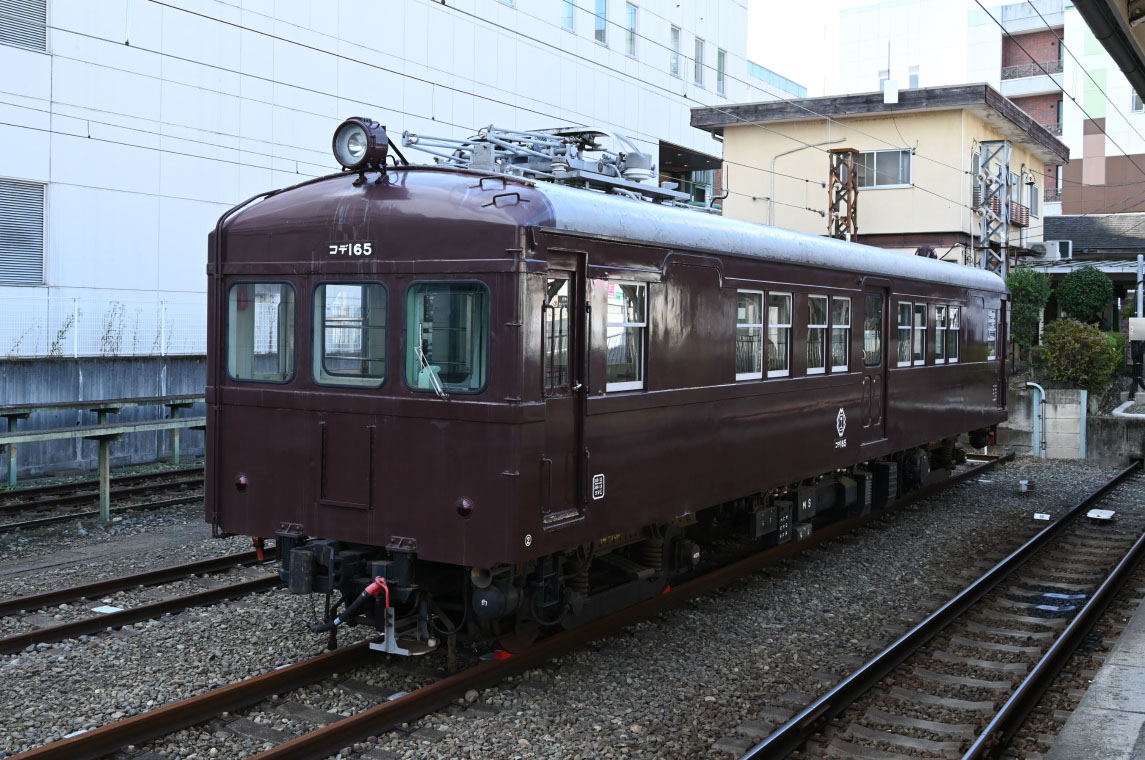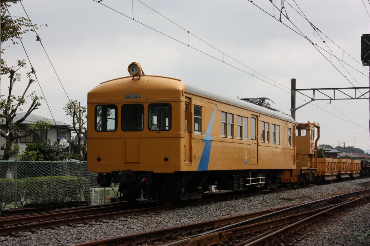 鉄道省モハ30166→クハ38108→国鉄クハ16156 →相模鉄道モハ2024→1976年譲受モハ165 1995年改造コデ165。 工事用に使用されています。 貴重な17m級国電の生き残りです。2018年からブドウ色に塗装されています。