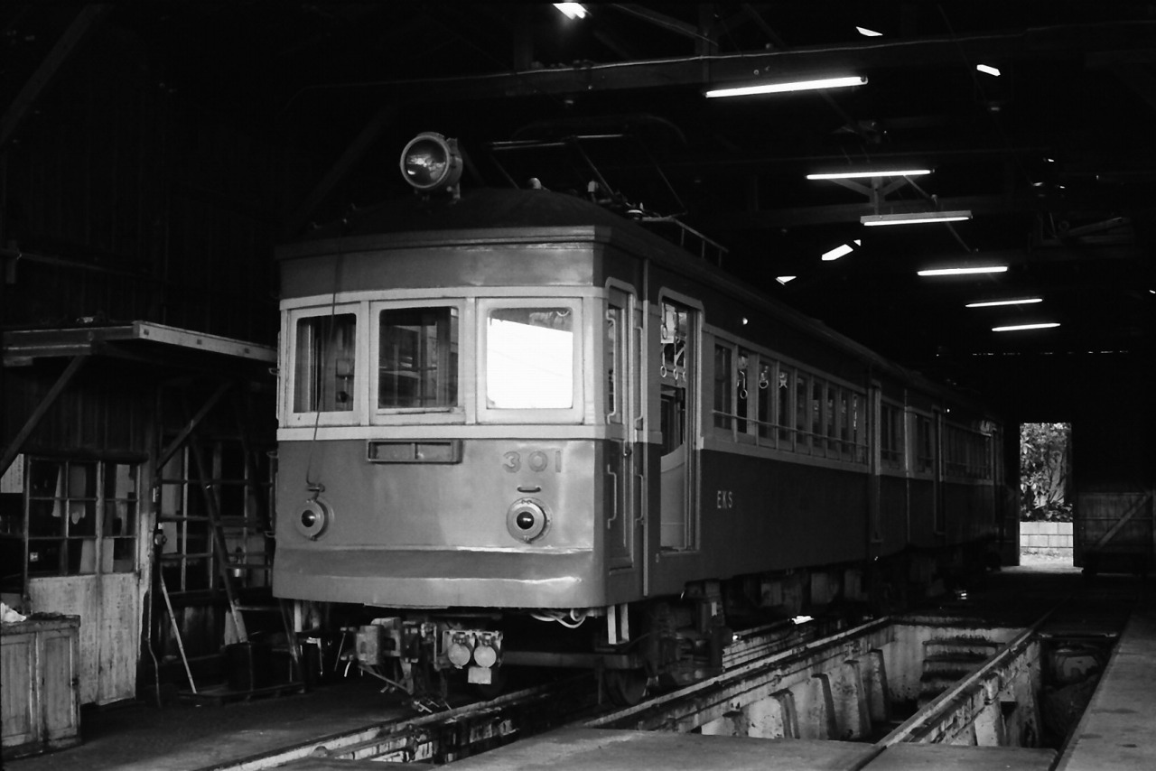 元王子電気軌道200形→東京都電150形の車体を利用した、江ノ電初の連接車。ヘッドライトがまだ改造前の姿。1992年廃車。