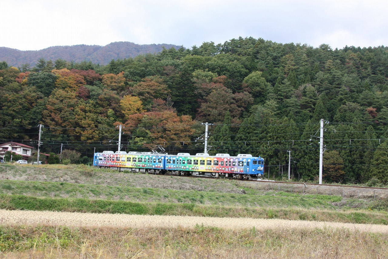 元JR東日本(国鉄)クモロ165-3(クモハ165-123)+モロ164-803(モハ164-850)+クロ165-3(クハ165-192)。「パノラマエクスプレスアルプス」を2001年に譲受。2編成ありましたが、1編成は2014年に廃車。 この編成も2016年に廃車され、クロ2001のみ下吉田駅で保存されています。反対側のクモロ2201は165系の面影を残していました。この編成が、国鉄急行型で最後に残った車両となりました。