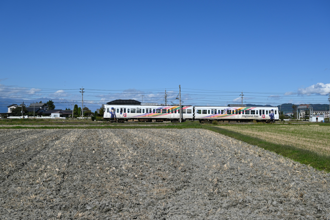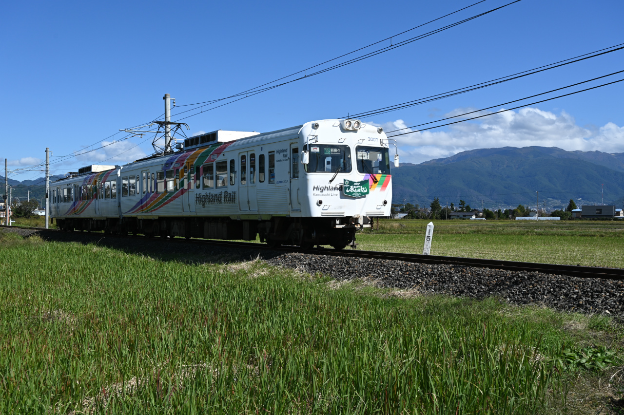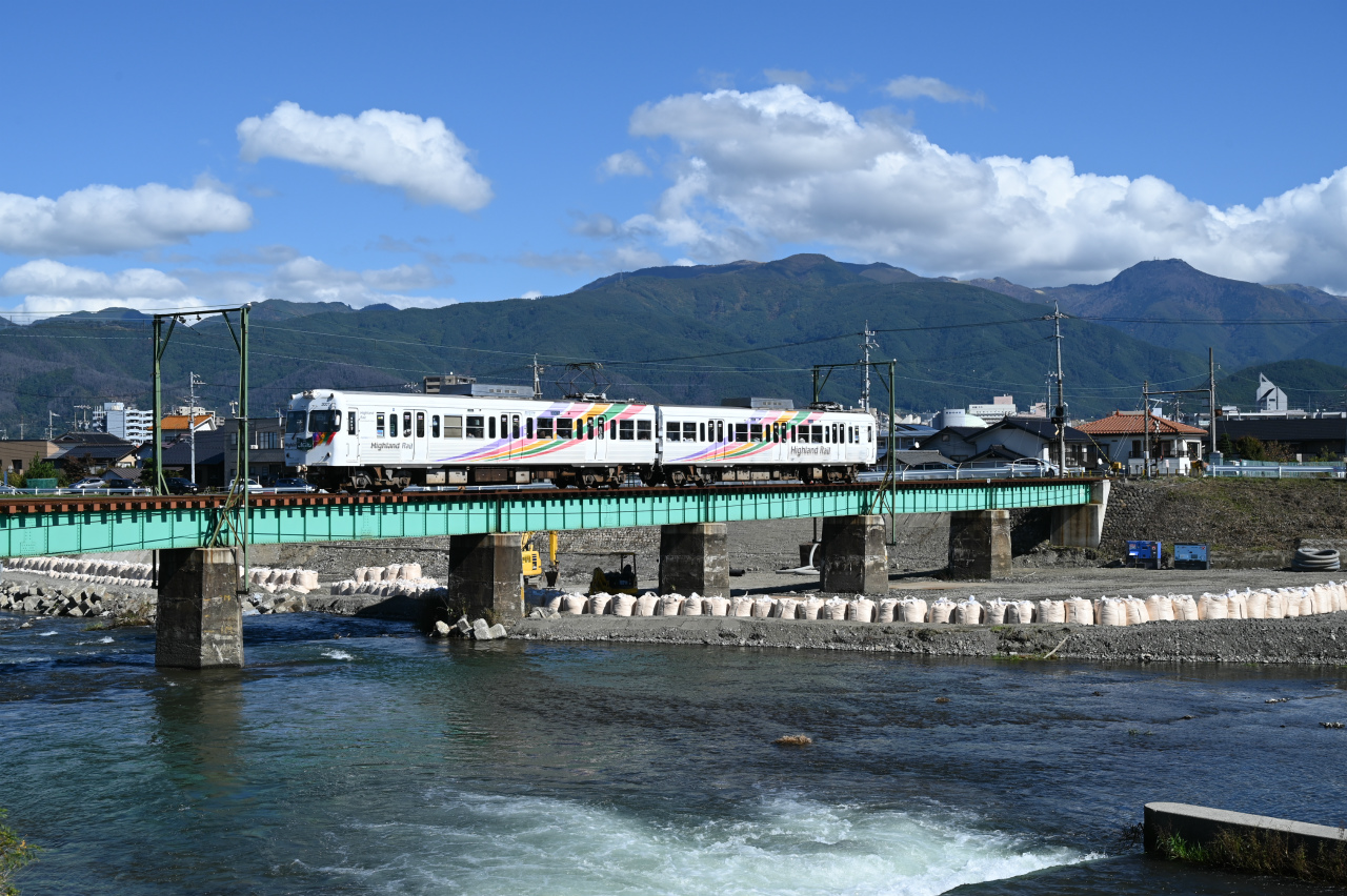 1964年東急車輌(現総合車両製作所)製の元京王帝都デハ3107+デハ3057。2000年譲受。奈良井川を渡ります。京王3000系は各地に譲渡されており、上毛電鉄700形、伊予鉄道3000系、北陸鉄道8000系・7700系、岳南鉄道7000形があります。