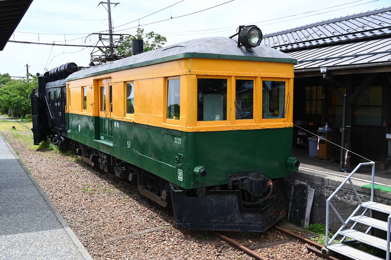 〇モワ51形モワ51号 1933年(昭和8)年東京の日本車輛で製作され、1982年(昭和57)年貨物輸送廃止まで肥料や米、野菜を積載した貨車の牽引にも活躍した電動貨車である。 新製以来ほとんど改造されず昭和初期の電車を今に伝えるデンテツ生え抜きの車輛である。貨物輸送廃止後はラッセル車を推進運転する除雪列車として活躍した。車体中央の貨物室は10t積。 (こころの停車場「月潟駅」と電車 の説明文です) |