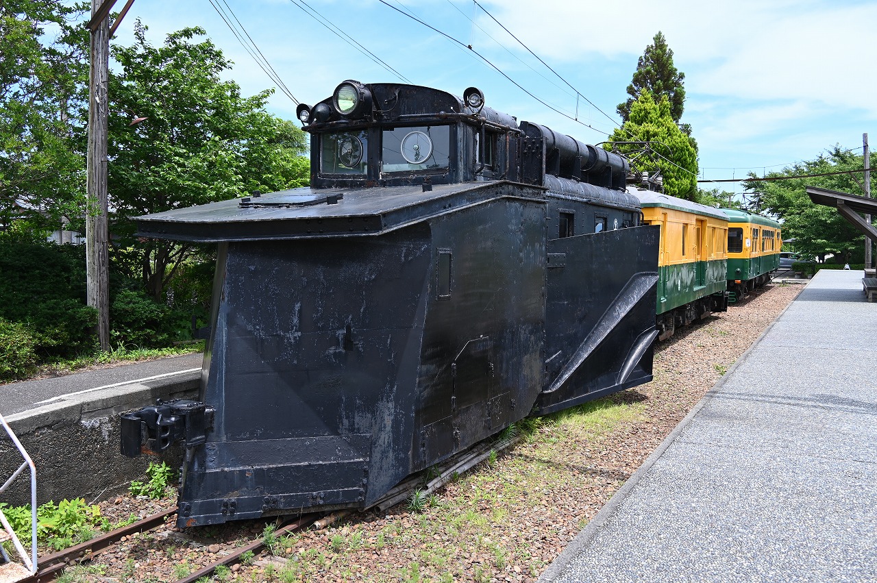 〇キ100形キ116号 1932年(昭和7)年、鉄道省の大宮工場で製作され、ラッセル装置付ディーゼル機関車が登場する以前の代表的な国鉄のラッセル車である。 かっては国鉄奥羽本線新庄駅常備の車輛であったが1968年(昭和48)年5月に新潟交通が当時の国鉄より購入し、以来30年以上にわたり冬の鉄路において活躍した。(こころの停車場「月潟駅」と電車 の説明文です) |