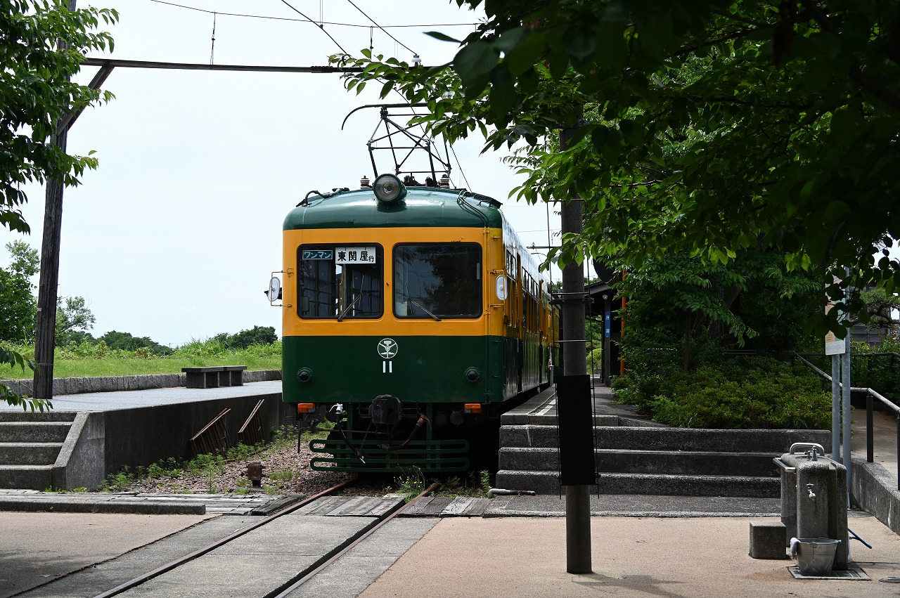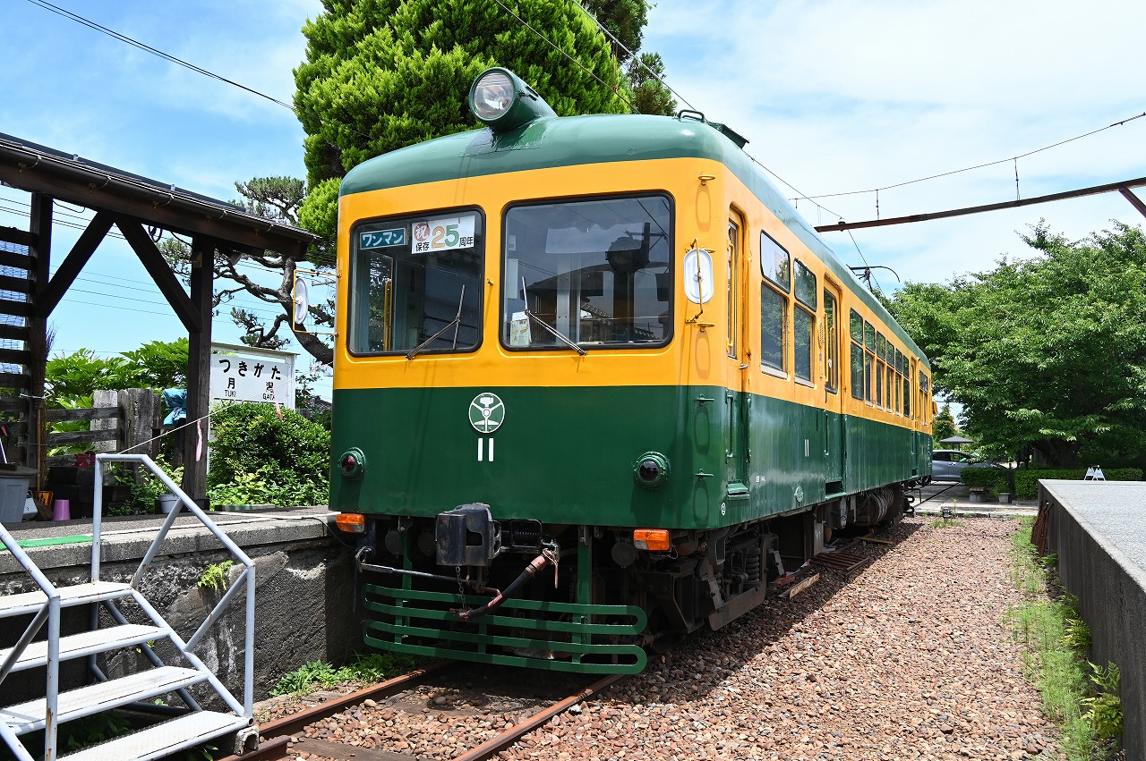 モハ11 今にも走り出しそうな雰囲気。線路は手前の方に100mくらい引かれており、架線もあります。実際、「かぼちゃ電車保存会」の尽力で自力走行ではないですが、車両移動機「アント」の動力で年1回動いています。 2024年6月27日撮影 |