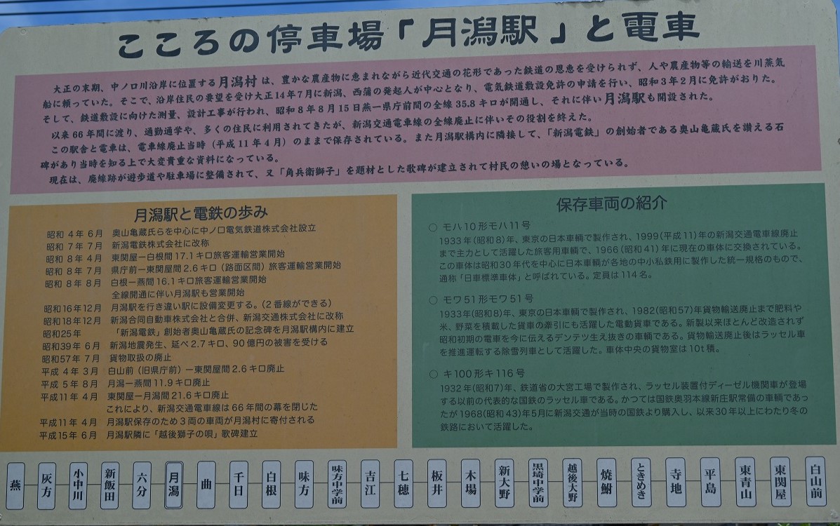 〇モハ10形モハ11号 1933年(昭和8)年、東京の日本車輛で製作され、1999(平成11)年の新潟交通電車線廃止まで主力として活躍した旅客用車輛で、1966年(昭和41)年に現在の車体に交換されている。 この車体は昭和30年代を中心に日本車輛が各地の中小私鉄用に製作した統一規格のもので、通称「日車標準車体」と呼ばれている。定員は114名(こころの停車場「月潟駅」と電車 の説明文です) |