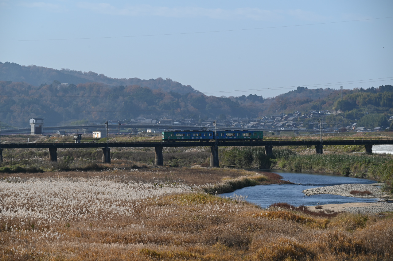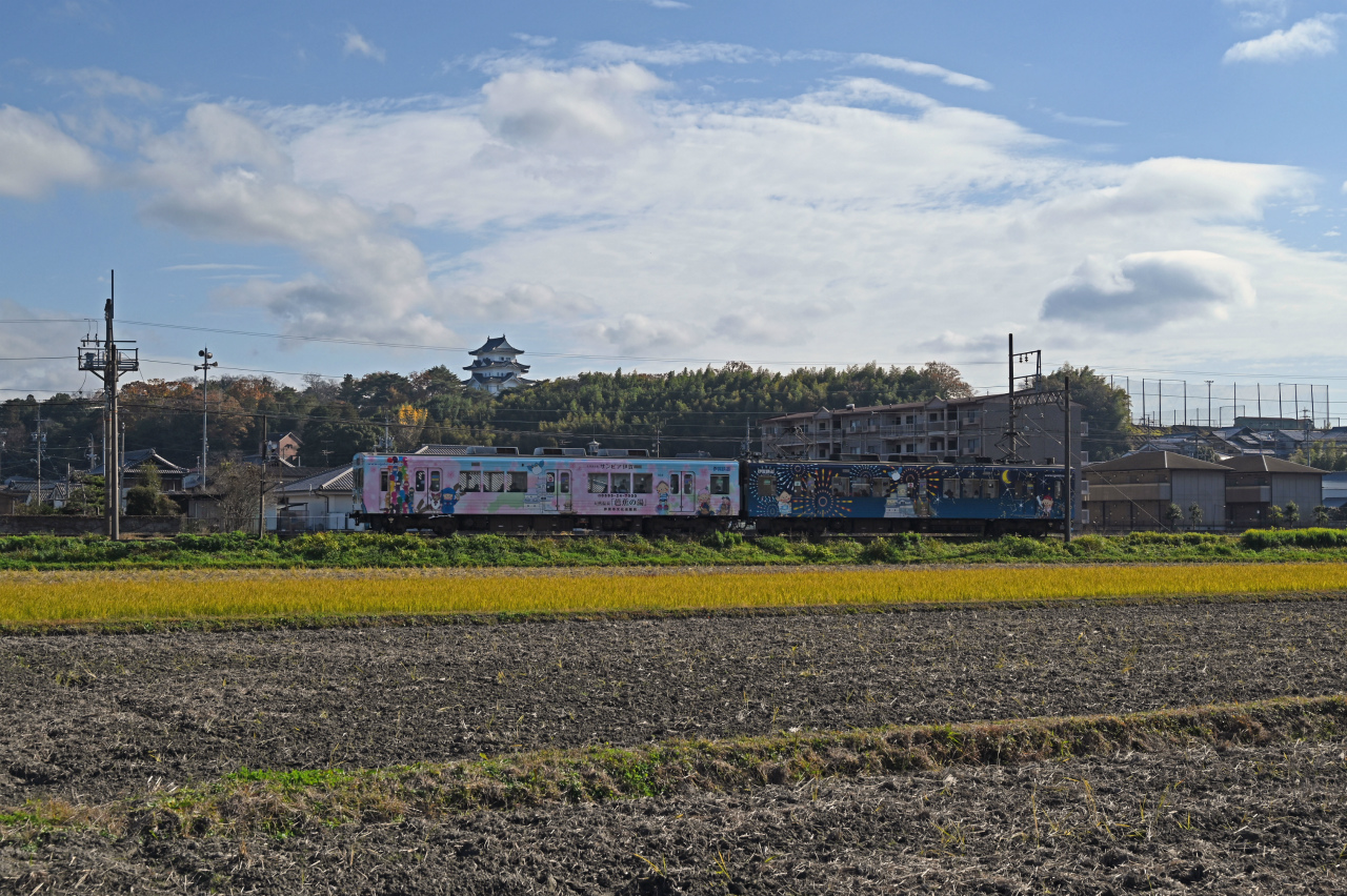 伊賀上野城を背景に伊賀盆地を走ります。なお、江戸時代には伊賀上野城に天守閣は存在せず、現在の天守は1935年に作られた模擬天守です。