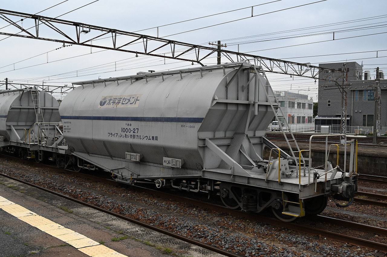 ホキ1000形フライアッシュ及び炭酸カルシウム専用貨車。1990年~1995年にかけて日本車輛にて34両製造されました。最高速度は75km。最高時速95kmのホキ1100に置き換わり、2021年に運用終了。 2019年3月30日撮影 JR富田 |