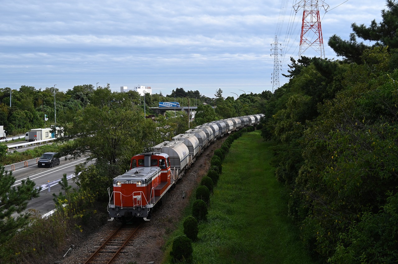 | 衣浦臨海鉄道 KE65形3号機の牽くホキ1100形。KE65形3号機はJRのDE10形500番台と同形で1975年日本車輛製の自社発注機。 碧南市駅からフライアッシュを輸送しています。 2024年10月28日撮影 |