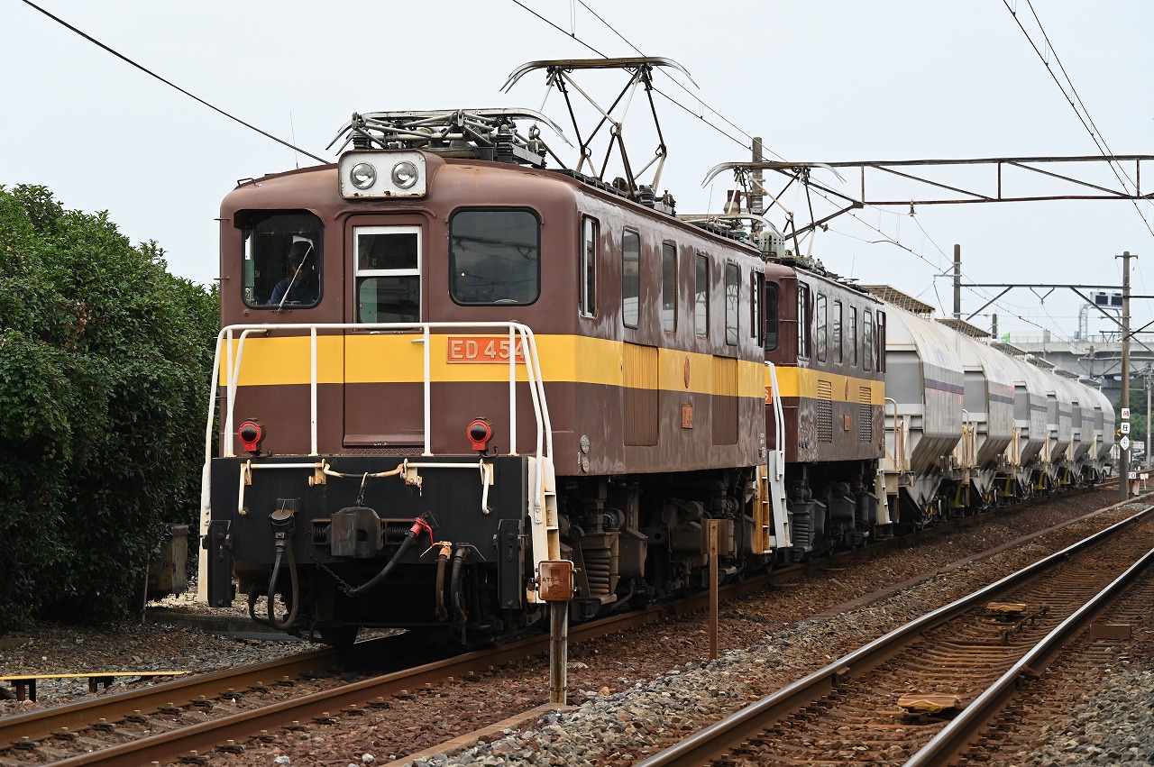 | ED454+ED456の牽く三岐鉄道線内のフライアッシュ輸送列車。 2024年10月29日撮影 三岐鉄道 保々 |