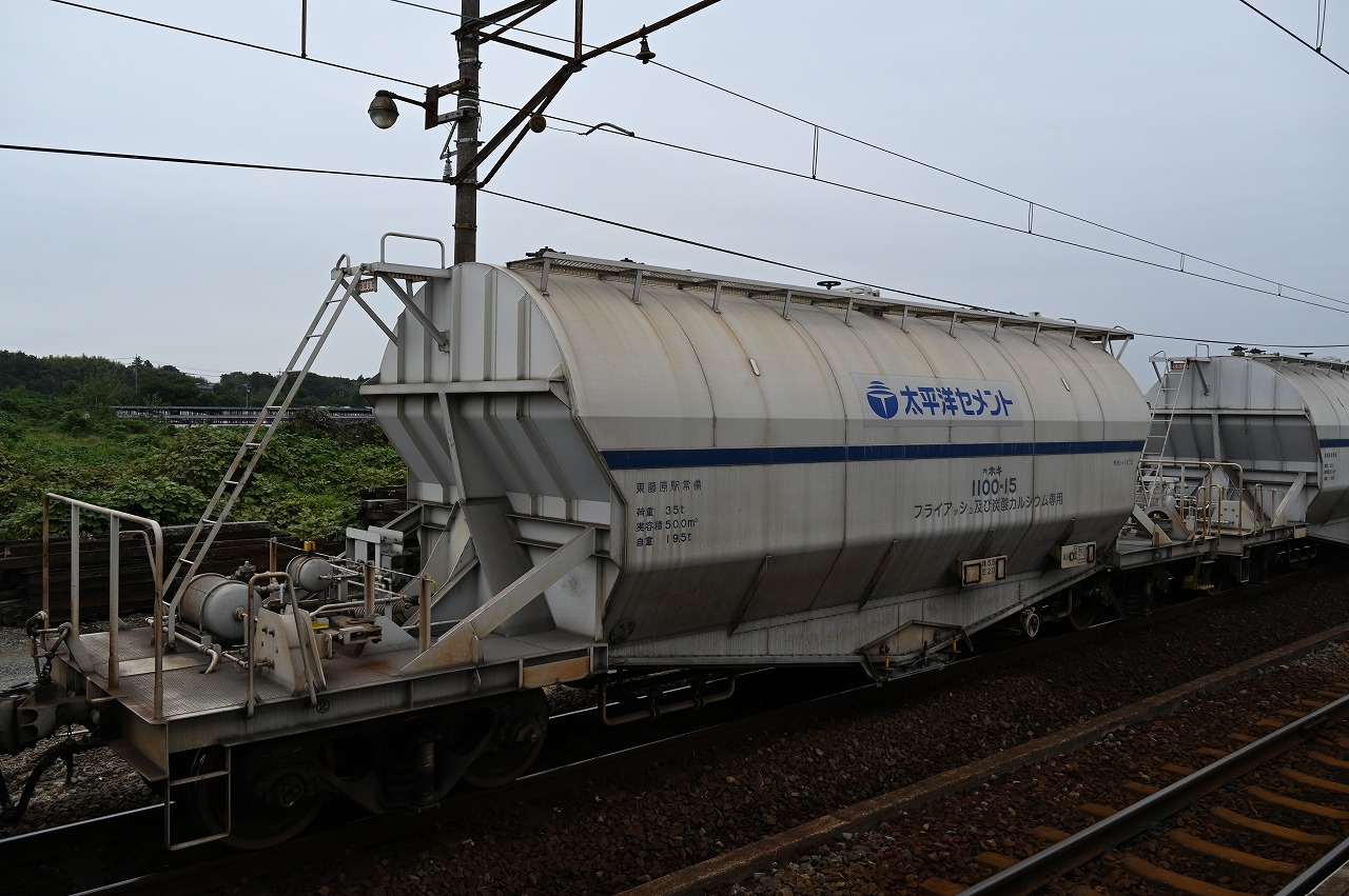 | ホキ1100形フライアッシュ及び炭酸カルシウム専用貨車。2016年~2021年にかけて日本車輛にて34両製造されました。最高速度が95kmに向上し、ホキ1000形を置き換えました。 2024年10月29日撮影 三岐鉄道 保々 |