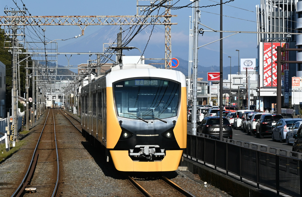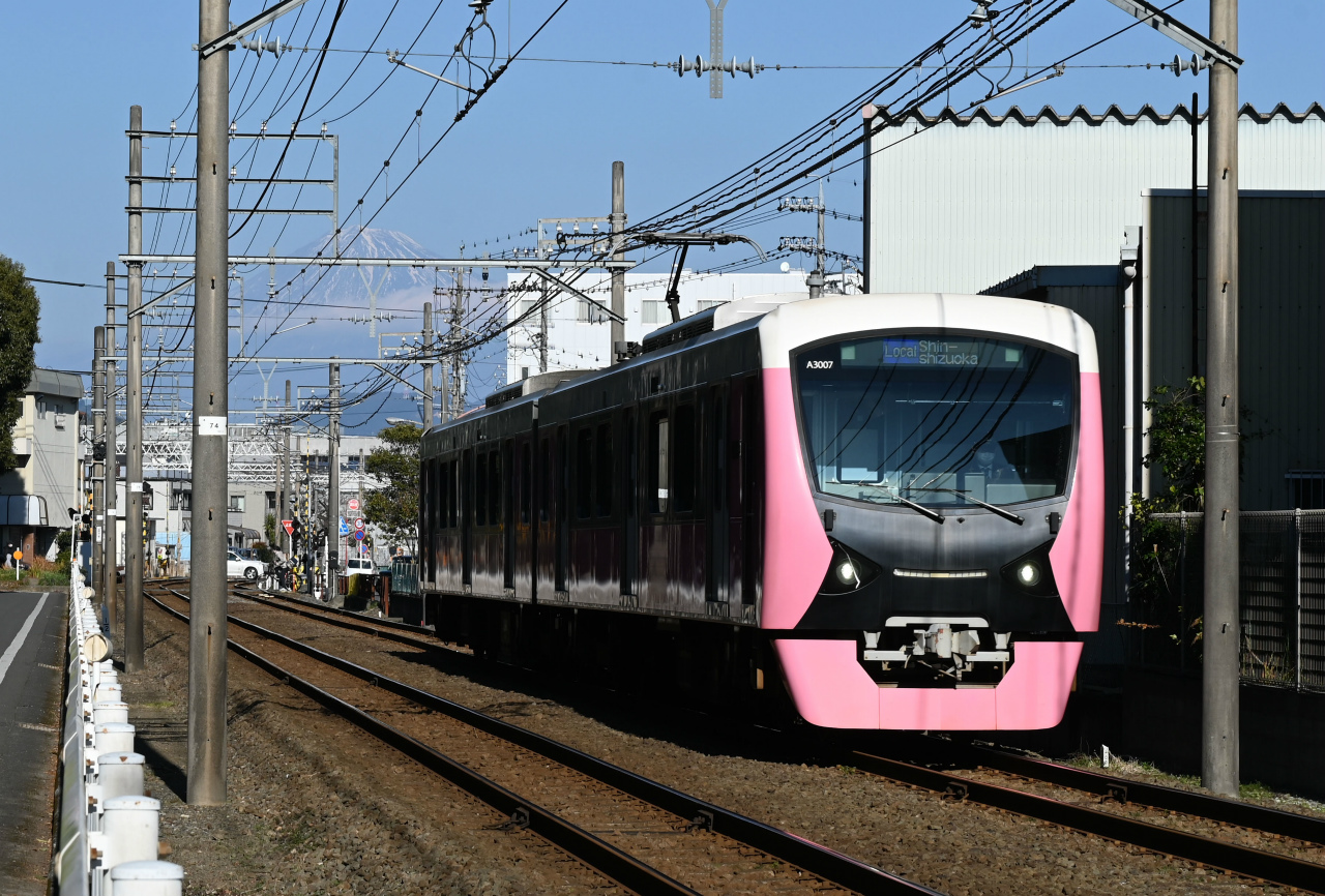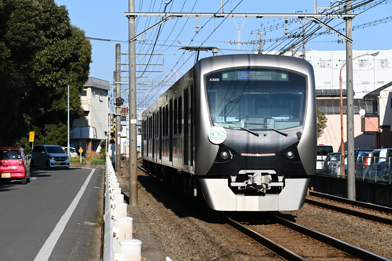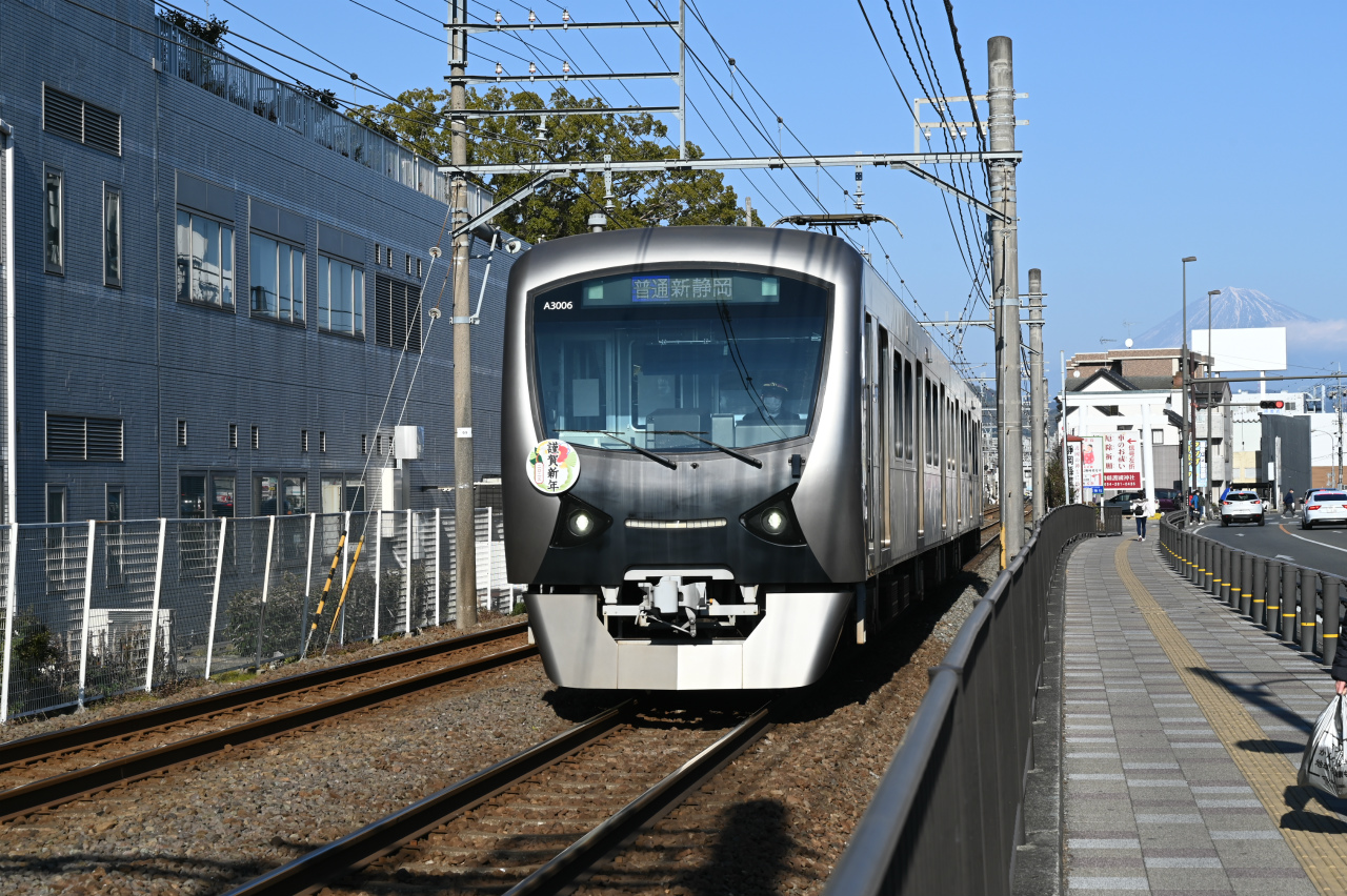 2018年総合車両製作所製のA3000形第4編成。塗装はブリリアントオレンジイエロー。A3000形は編成毎に色を変え、sizuoka rainbow trainsとなっています。