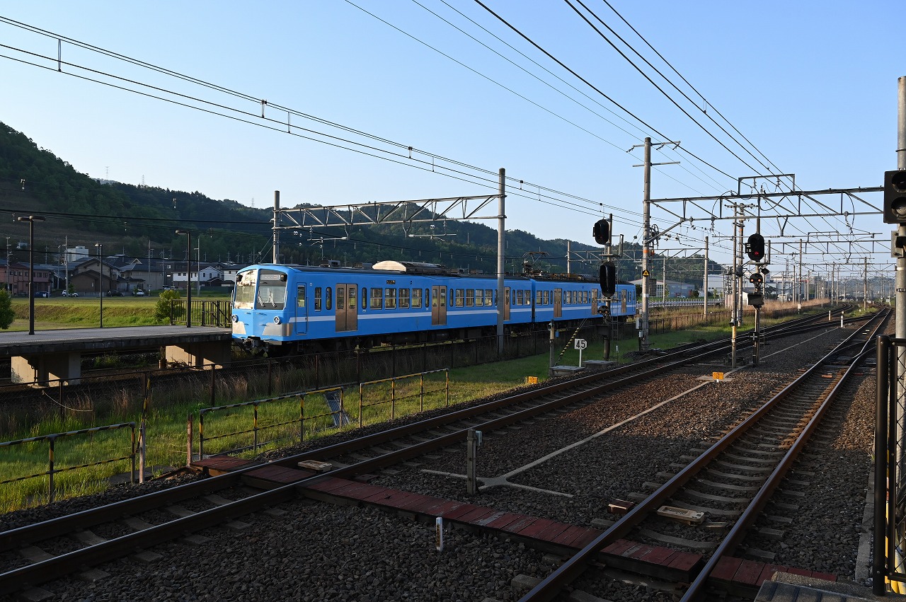 元西武101系クモハ282+クモハ281。元西武101系は各地で活躍しており、三岐鉄道751形、流鉄5000形、伊豆箱根鉄道1300系、秩父鉄道6000系、上信電鉄500形があります。早朝の米原駅です。