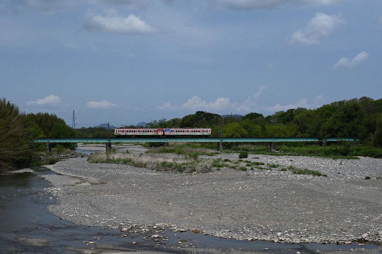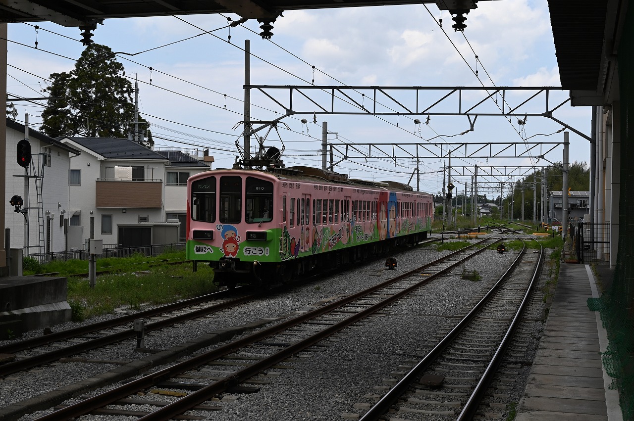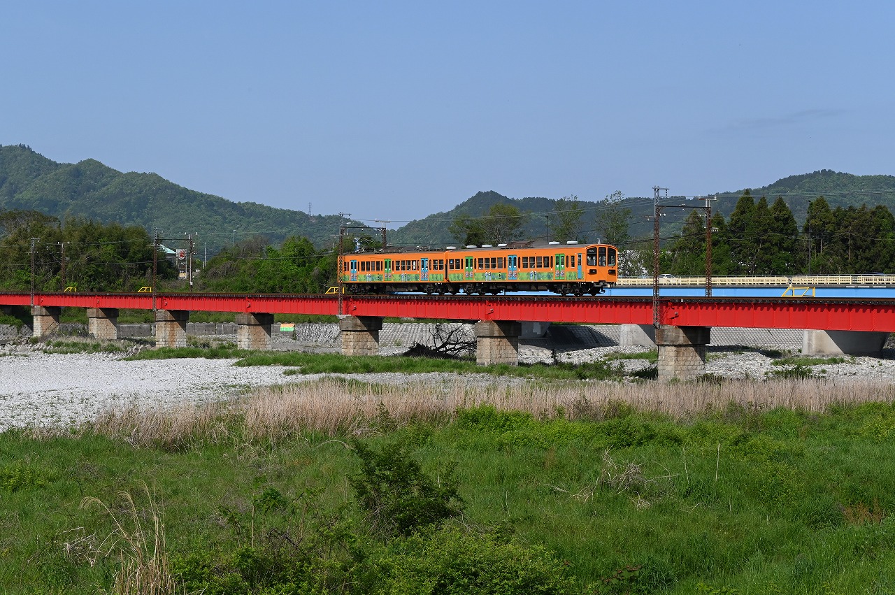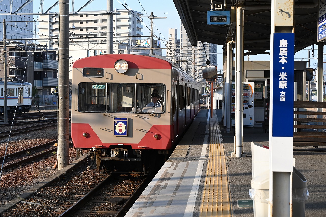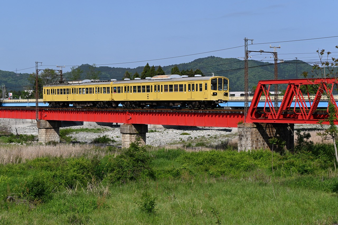 元西武401系クモハ431+クモハ432。同系車に三岐鉄道101系上信電鉄150形がありますが、上信電鉄150形は2018年に引退しました。 1997年彦根工場で改造されていますが、西武時代の面影を残しています。西武時代の赤電に塗装されています。
