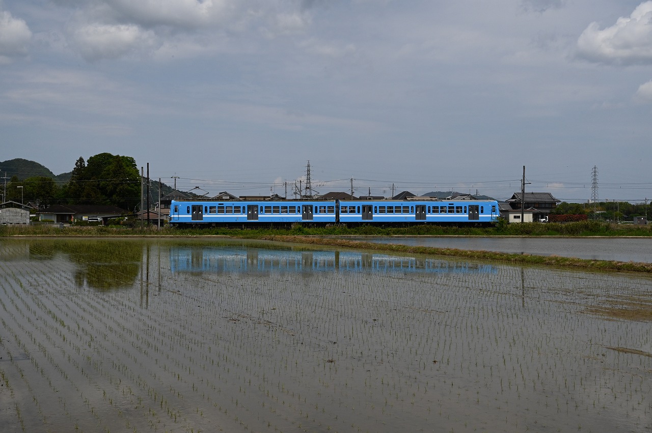 田植えの終わった田んぼにブルーの車体が映えていました。