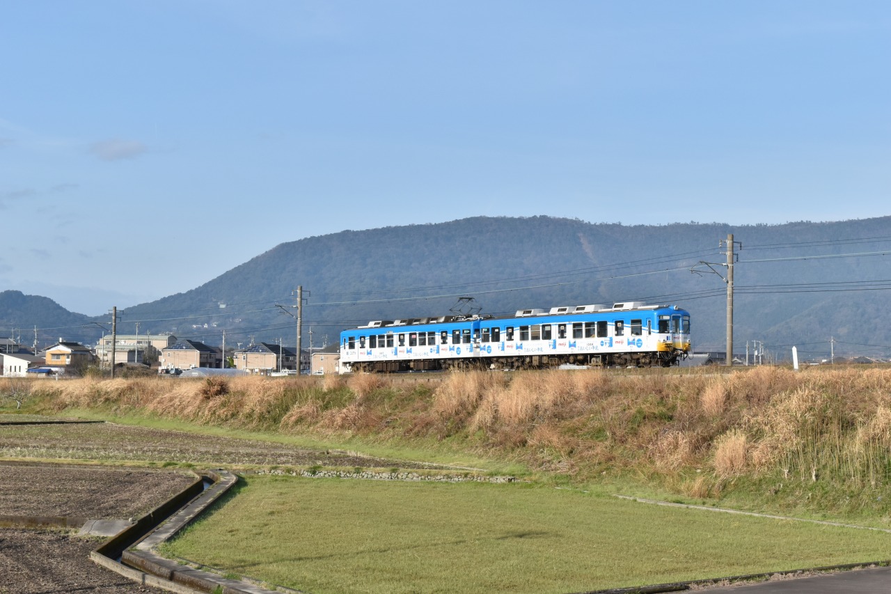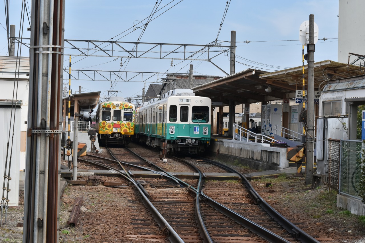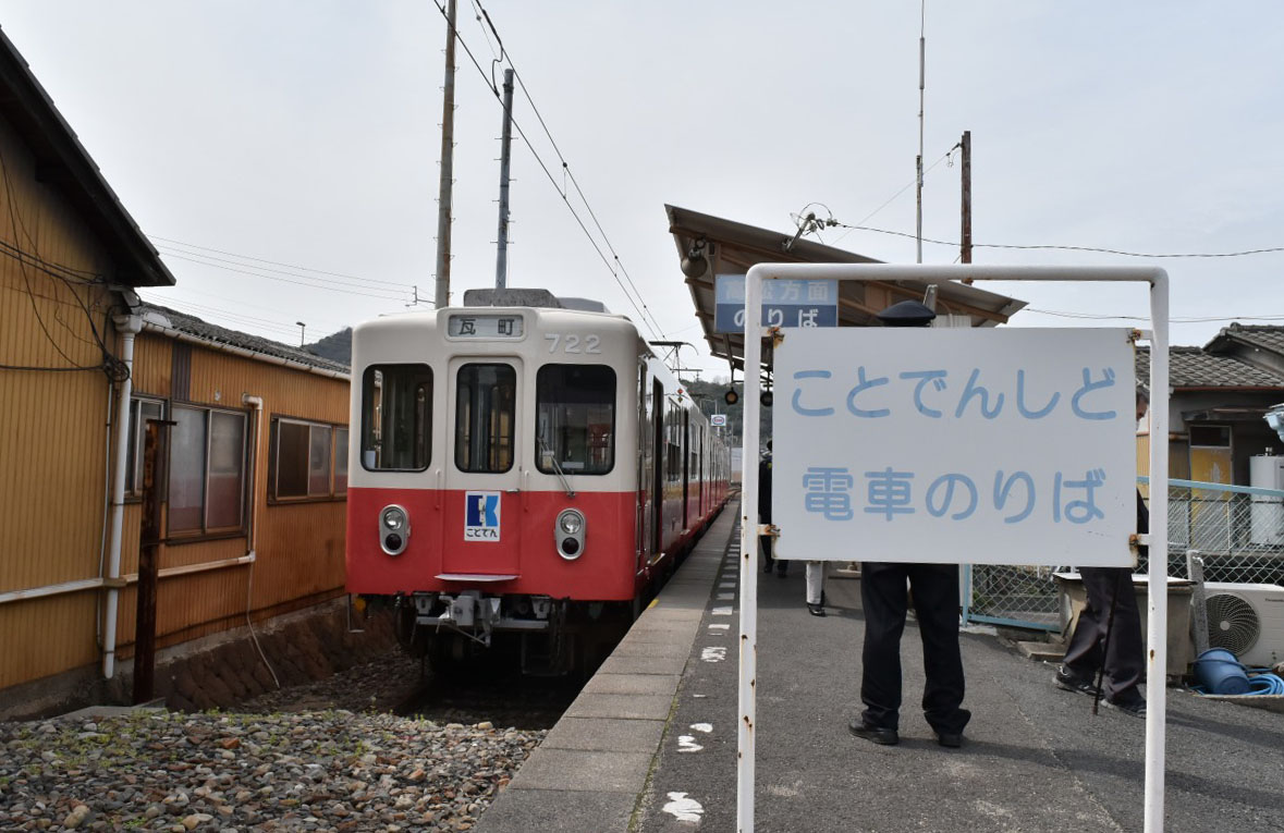 1969年東急車輛(現総合車両製作所)製の元京王帝都5000系デハ5073+デハ5023。1997年に京王線から来ました。 同系車に一畑電車2100系、伊予鉄道700系→銚子電鉄3000形、富士急行1000形・1200形→岳南電車9000形があります。金刀比羅宮の最寄り駅で、大きな灯籠があります。