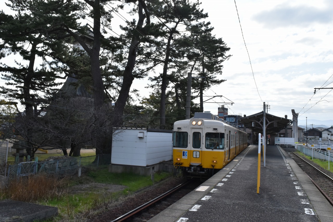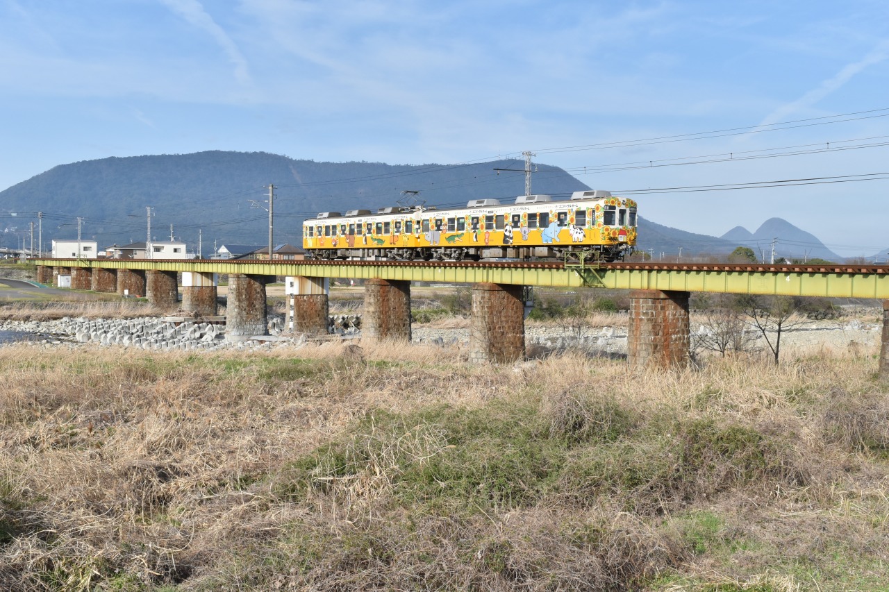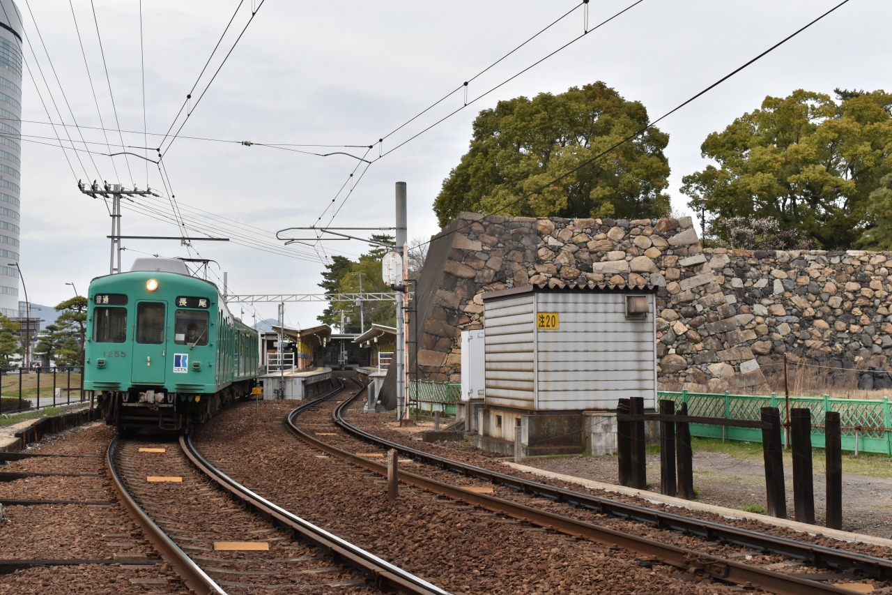 1969年東急車輛(現総合車両製作所)製の元京王帝都5000系デハ5073+デハ5023。1997年に京王線から来ました。 同系車に一畑電車2100系、伊予鉄道700系→銚子電鉄3000形、富士急行1000形・1200形→岳南電車9000形があります。金刀比羅宮の最寄り駅で、大きな灯籠があります。