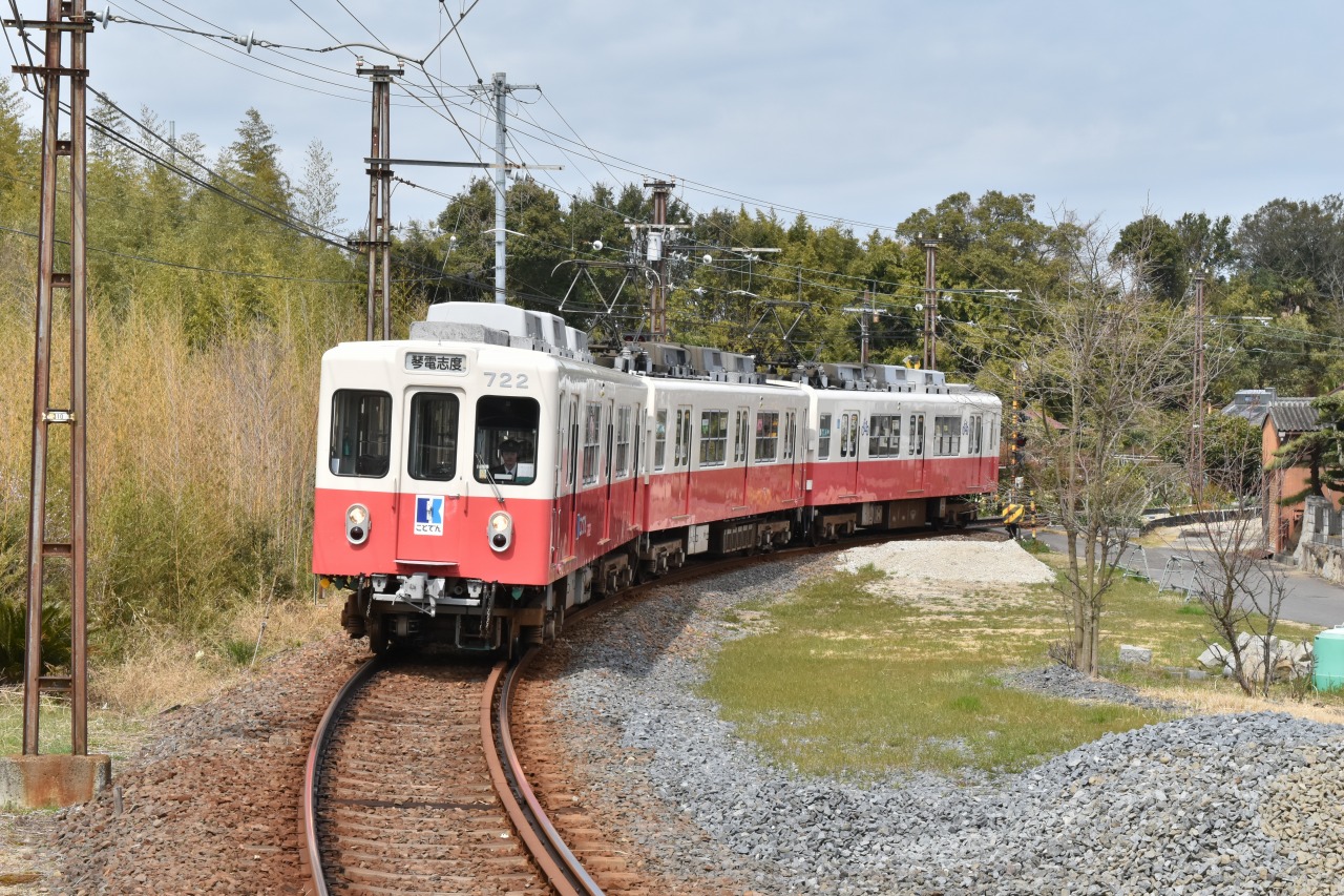 1967年川崎車輛(現川崎重工業)製の元京浜急行700系デハ702+デハ701。2005年に琴電に来ました。予算本線をアンダークロスしてすぐのところです。