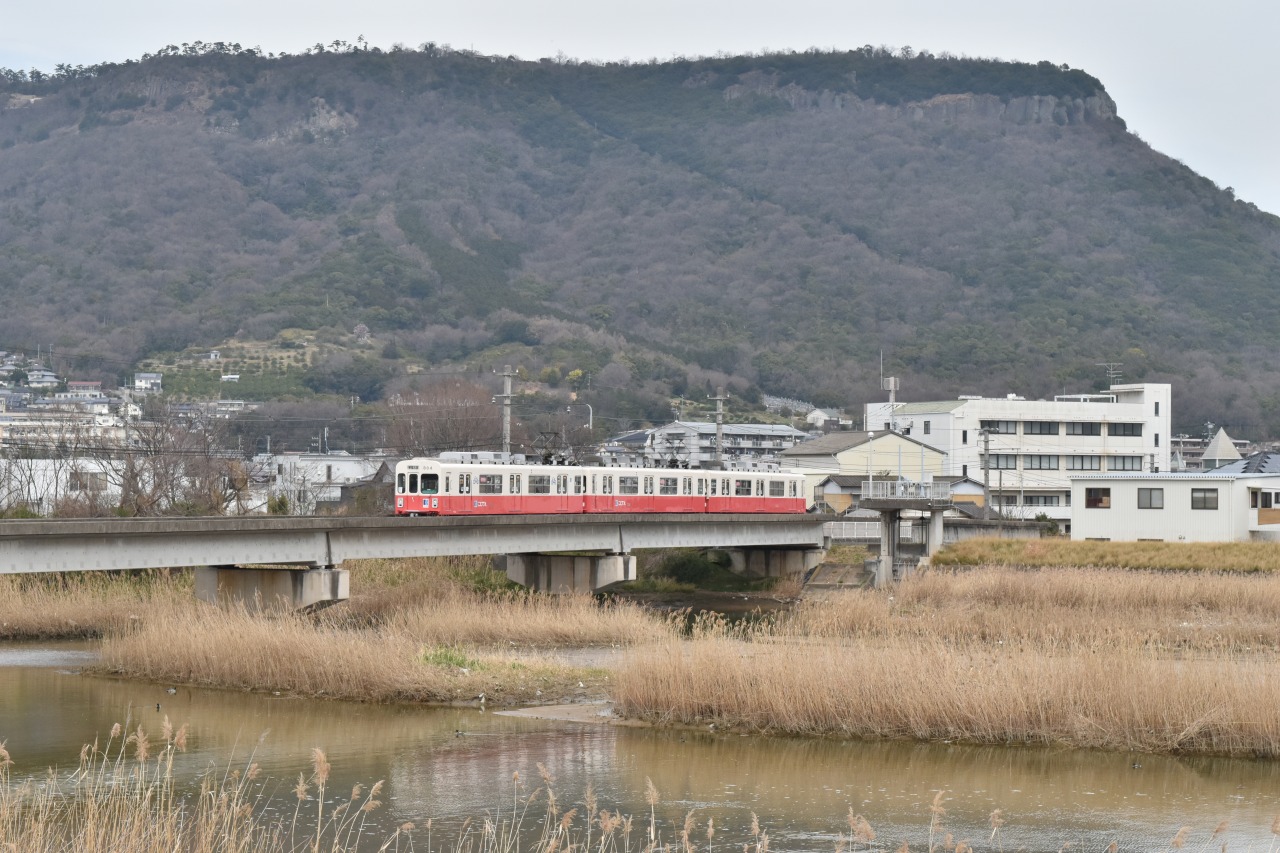 1967年川崎車輛(現川崎重工業)製の元京浜急行700系デハ704+デハ703。2005年に琴電に来ました。後方の山の左端に小さく金刀比羅宮が見えます。