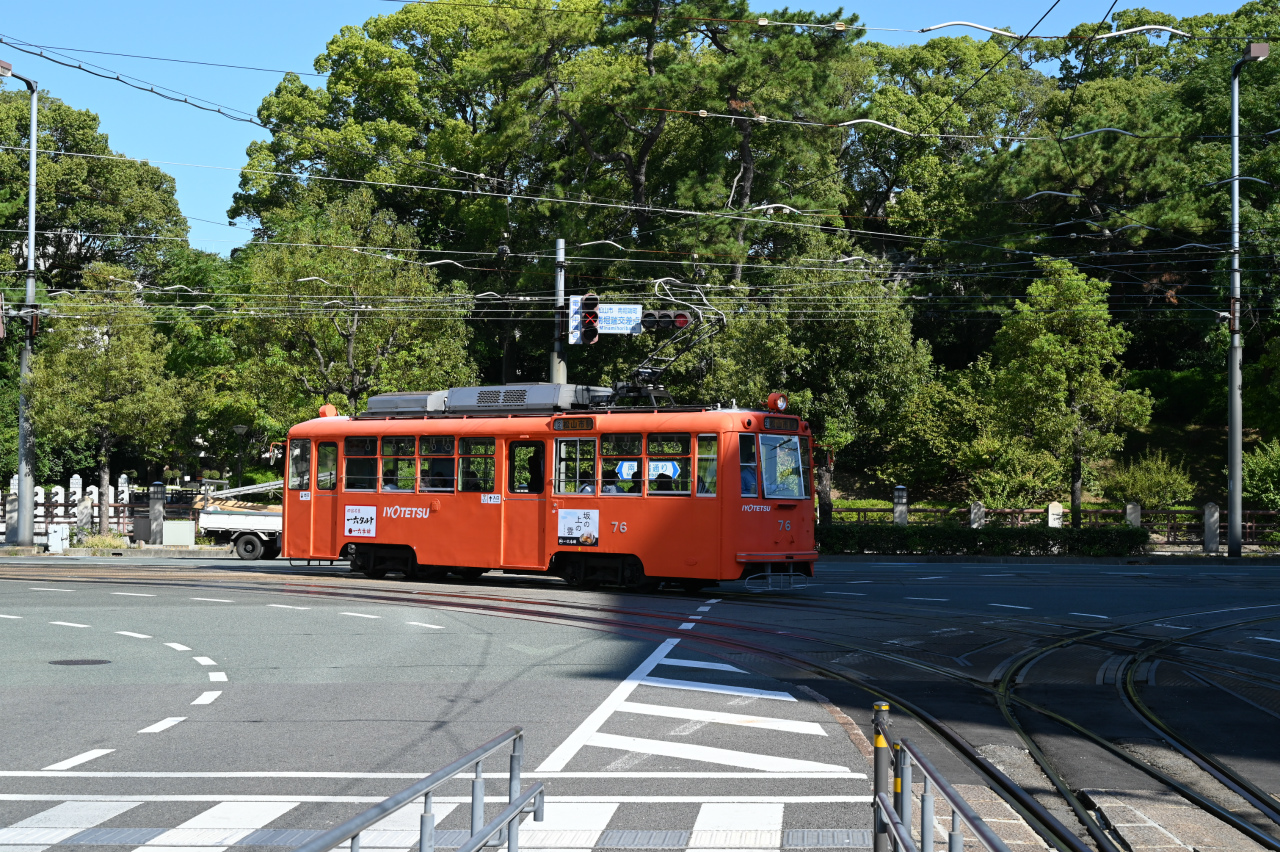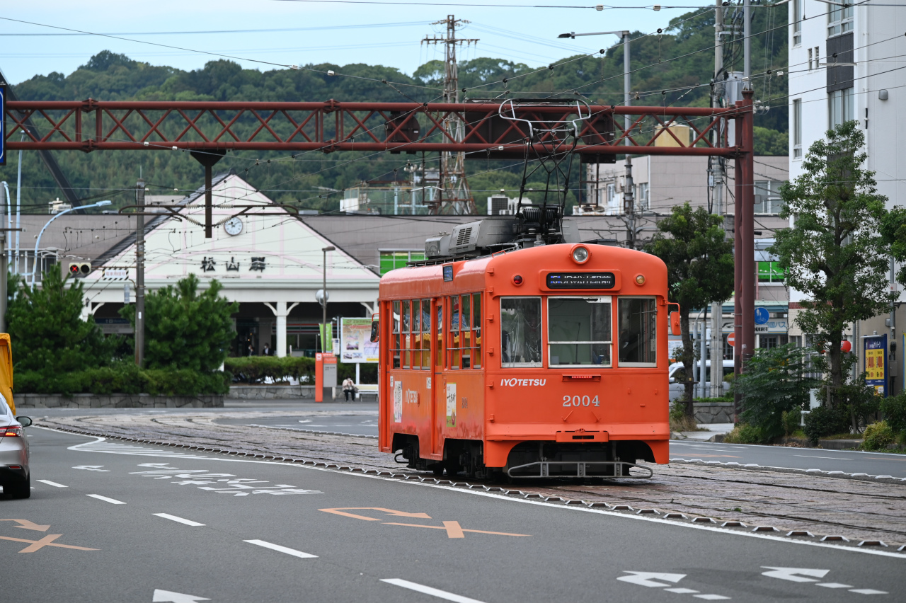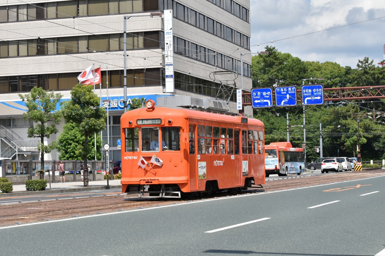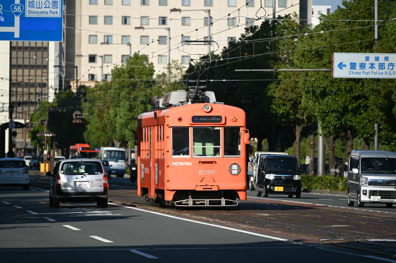 元京都市電2000形。1977年の河原町線廃止時点で京都市電では運用を外れ、梅小路公園に保存されている2001を除き、伊予鉄道に譲渡されました。伊予鉄道での在籍期間が京都市電よりはるかに長くなっています。