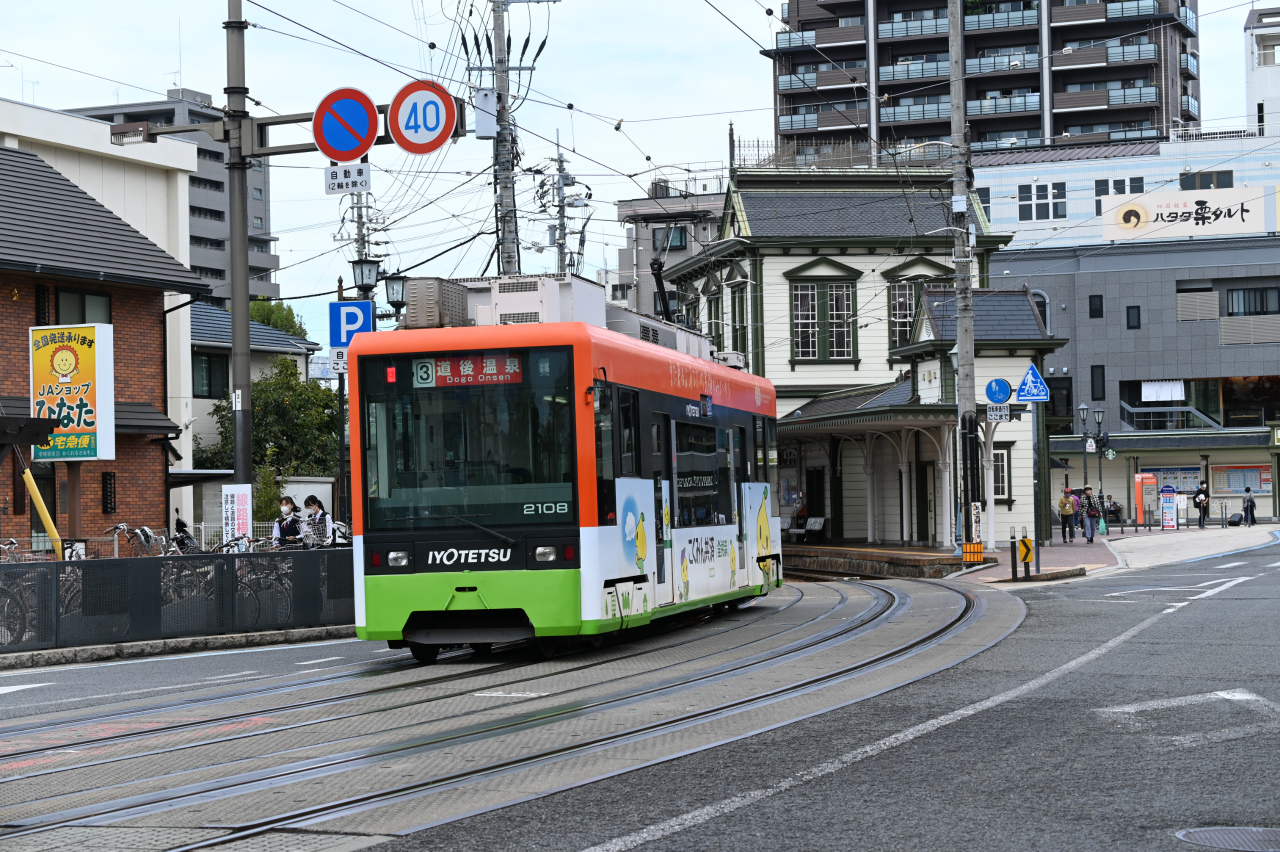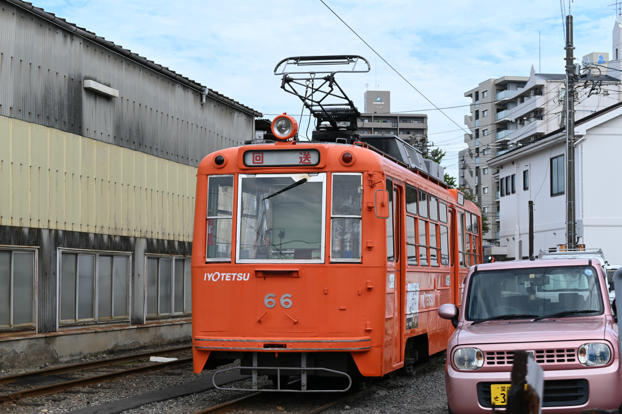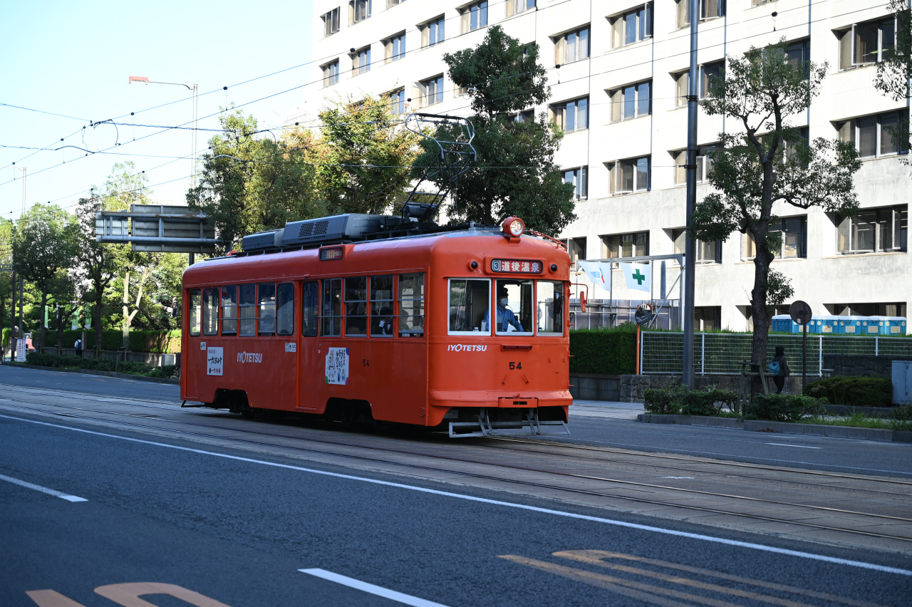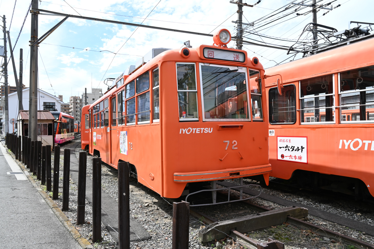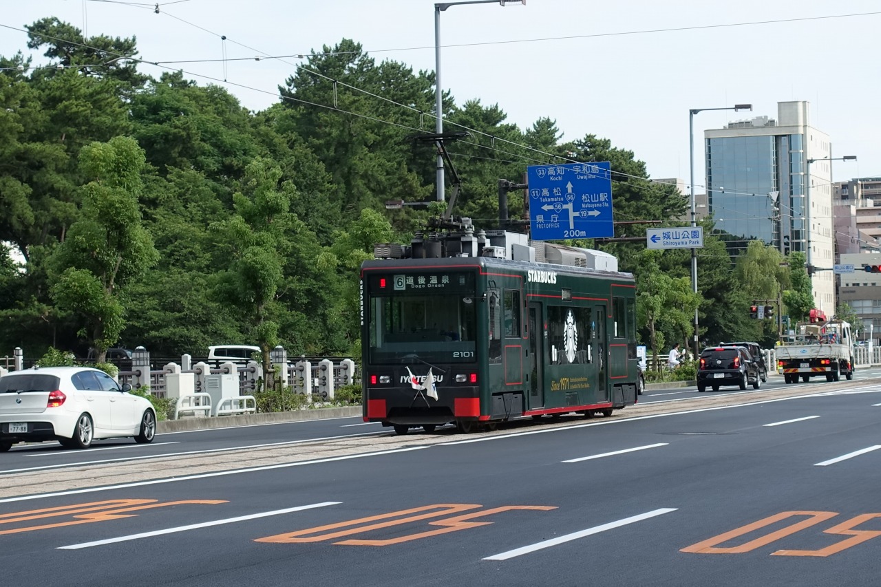 元京都市電2000形。1977年の河原町線廃止時点で京都市電では運用を外れ、梅小路公園に保存されている2001を除き、伊予鉄道に譲渡されました。伊予鉄道での在籍期間が京都市電よりはるかに長くなっています。