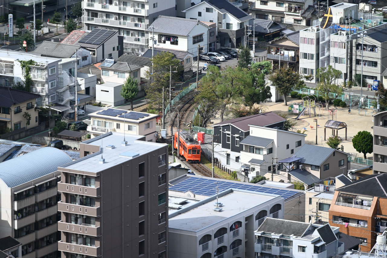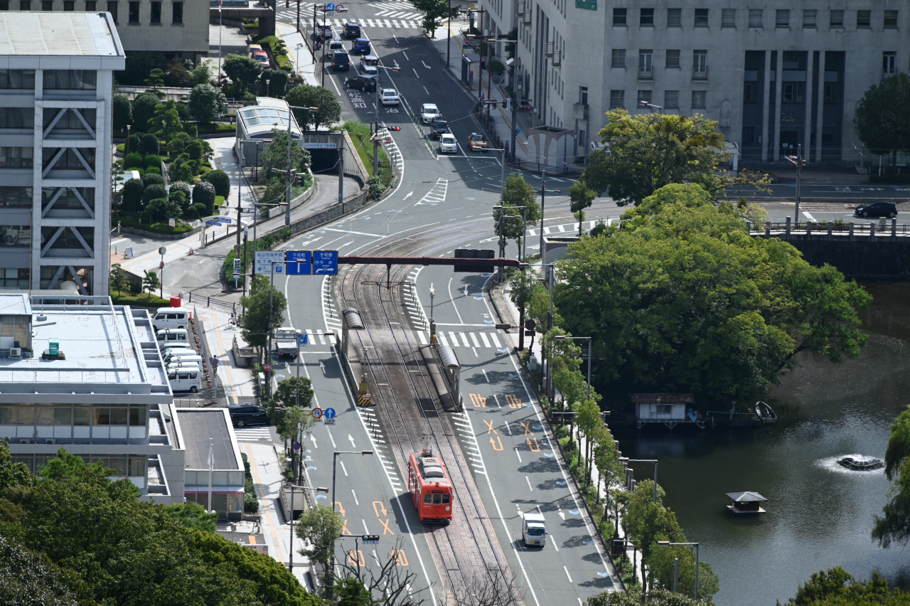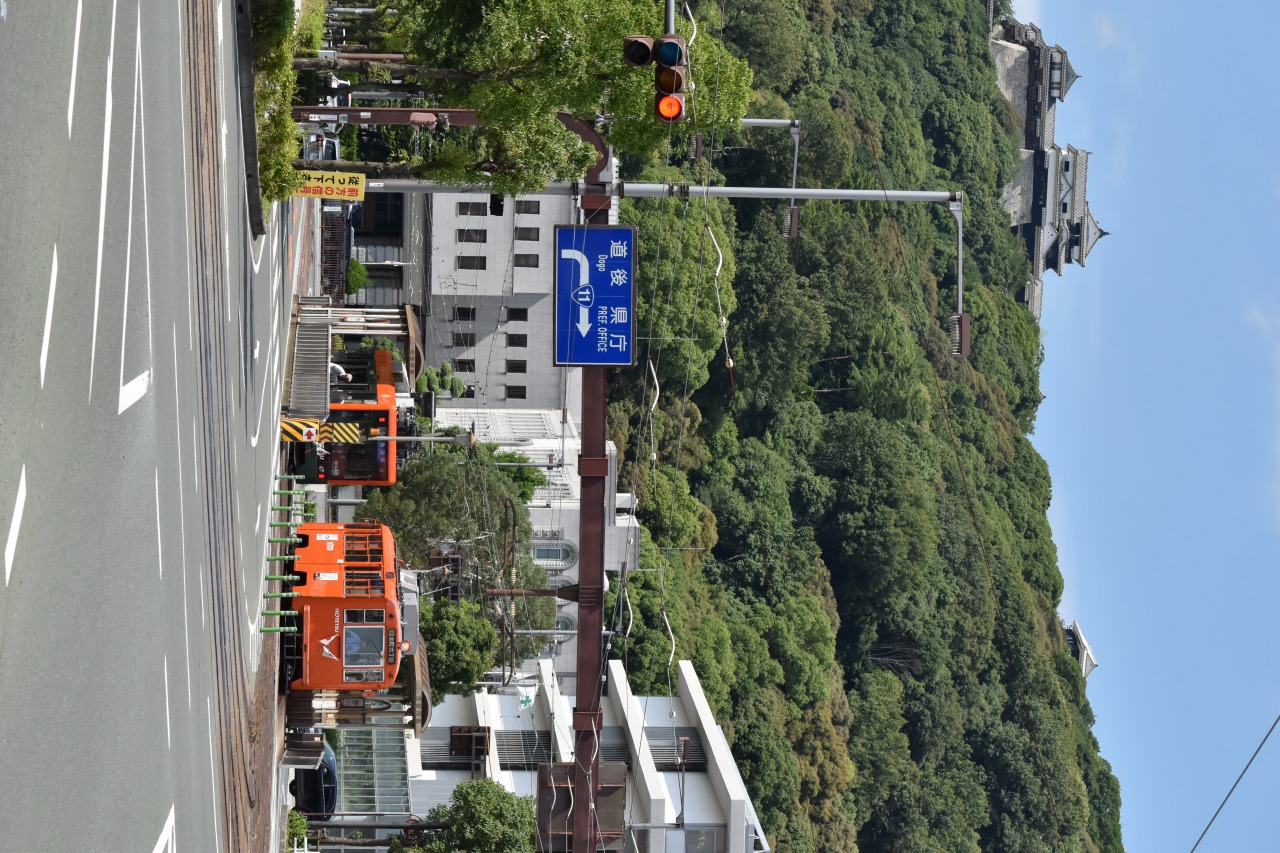 松山城の天守から北の方は城北線の高砂町~鉄砲町が見えます。南には城南線の県庁前~市役所前が見えます。