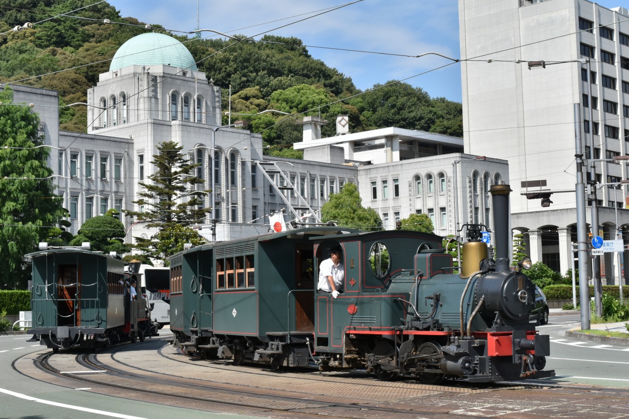「坊ちゃん列車」が市役所前ですれ違っていきました。