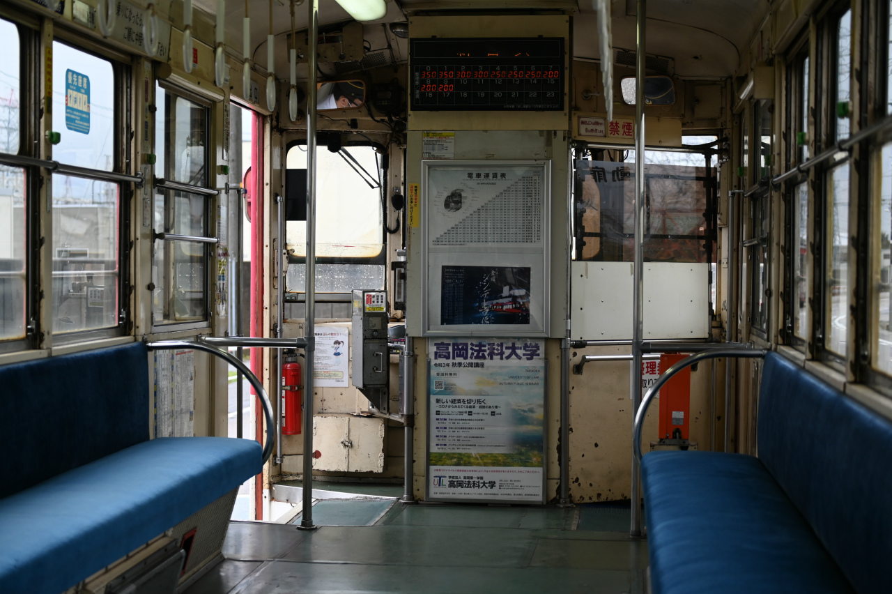 1967年日本車輛製。冷房化されています。加越能時代。米島口から次の能町口までJR氷見線と新湊線をオーバークロスする専用軌道となっています。