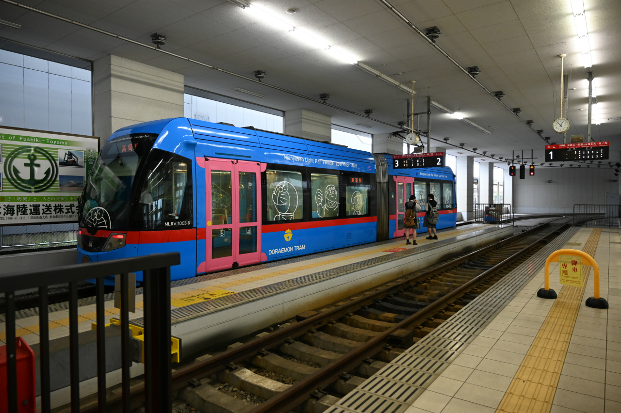 2006年新潟トランシス製のLRV。4代目どらえもんトラムになっています。高岡電停は駅ビルの中になり、利便性がアップしました。