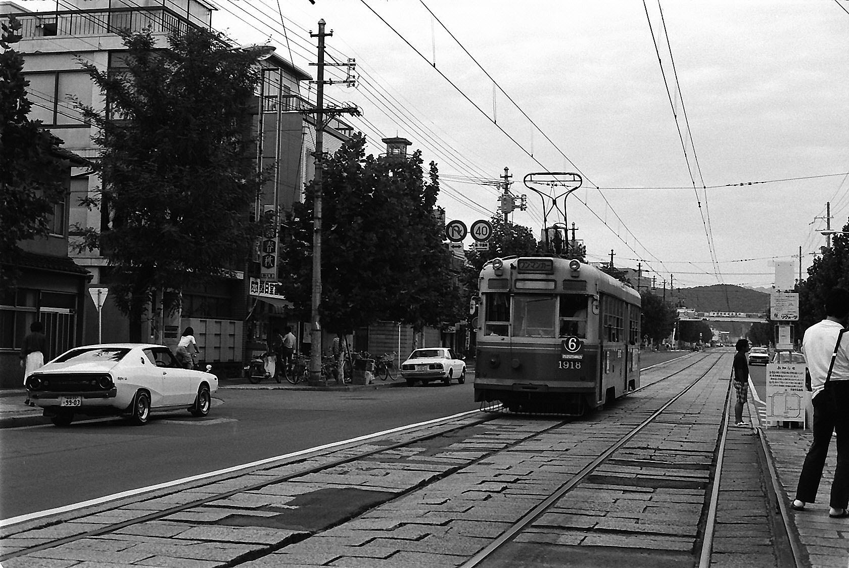 1900形1918 6番系統烏丸車庫行き。烏丸線廃止後、京都駅前~烏丸車庫となり全線廃止まで存続しました。廃止後は広島電鉄に譲渡され、1903。 1978年9月24日撮影 叡電前 |