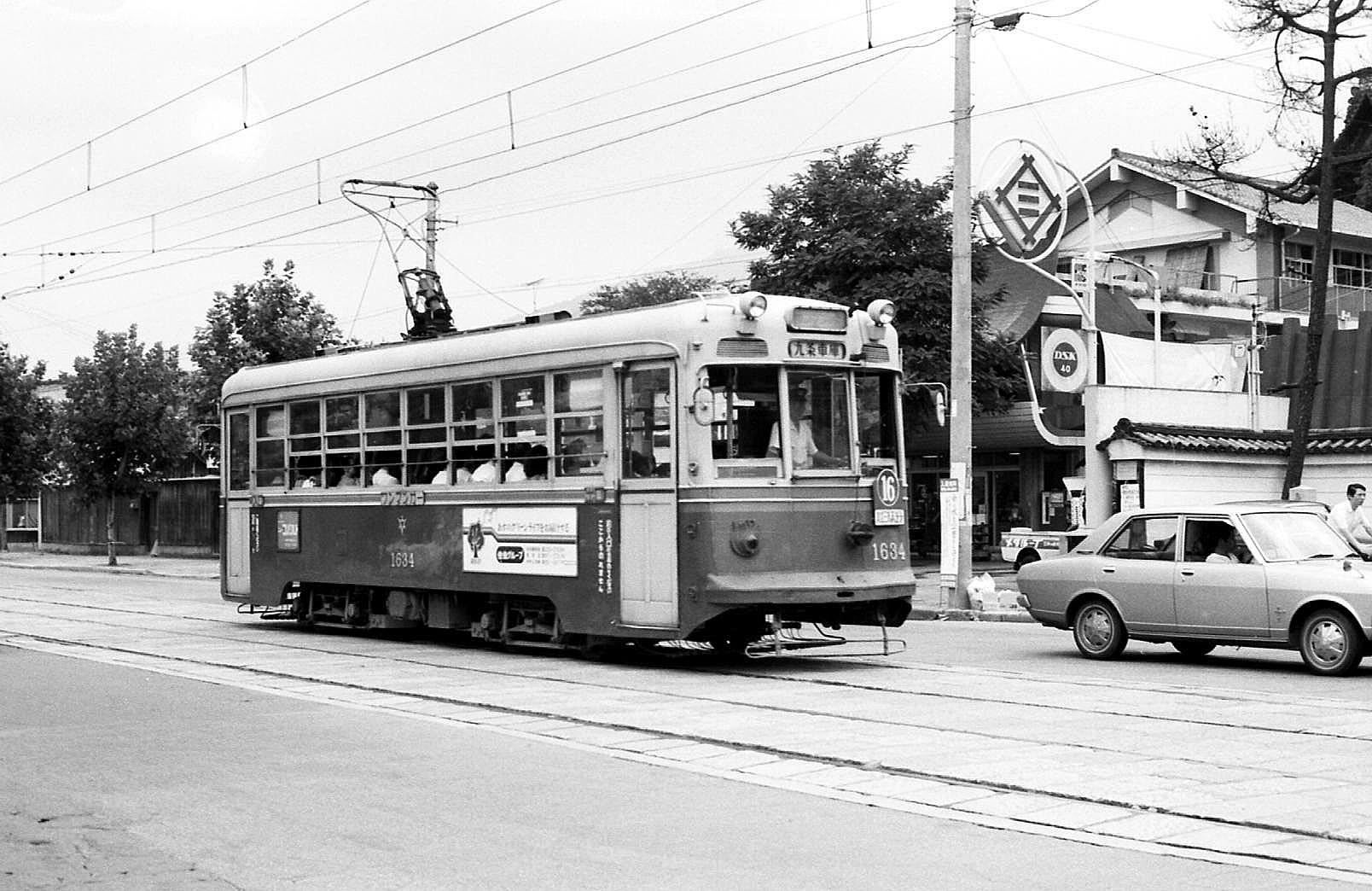 1600形1634 16番系統九条車庫行き。1973年9月撮影 飛鳥井町~百万遍 |