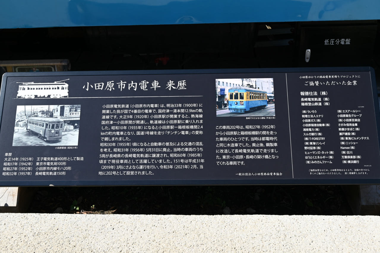 1925年製の王子電気軌道400形→1942年東京都電100形→1952年箱根登山鉄道小田原市内線モハ20形→1957年長崎電気軌道150形。 150形151(元20形201の151が1987年に廃車となり、元202の152が151に改番)が2019年に廃車となり、小田原で保存されています。 箱根登山鉄道時代は木造車で長崎に行くときに鋼板を張り、窓配置も変更されています。番号は202になっていますが、長崎電気軌道時代の姿で保存されています。