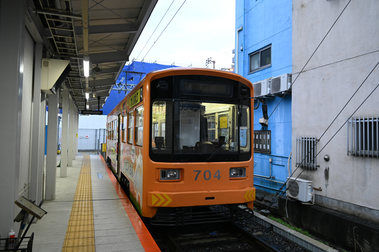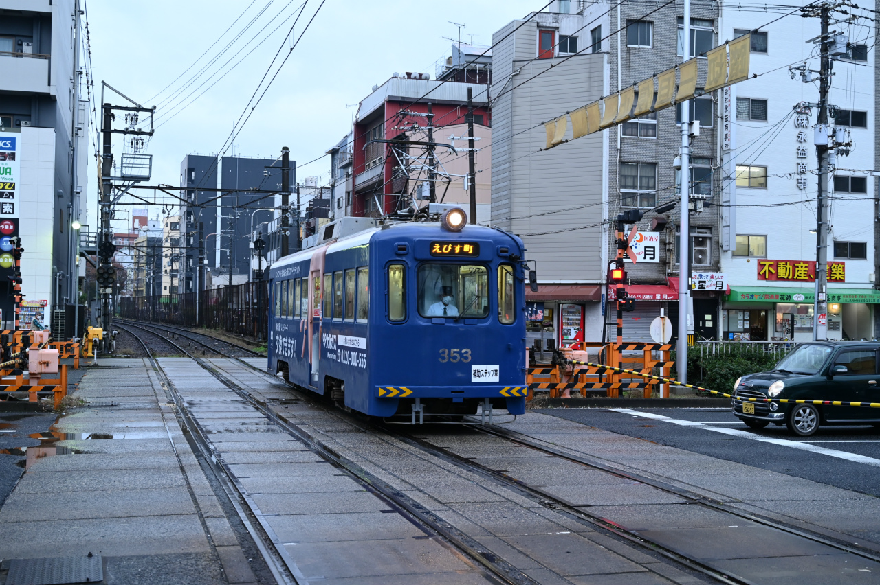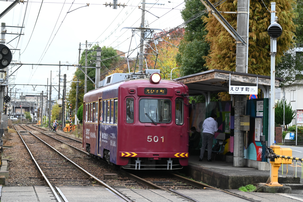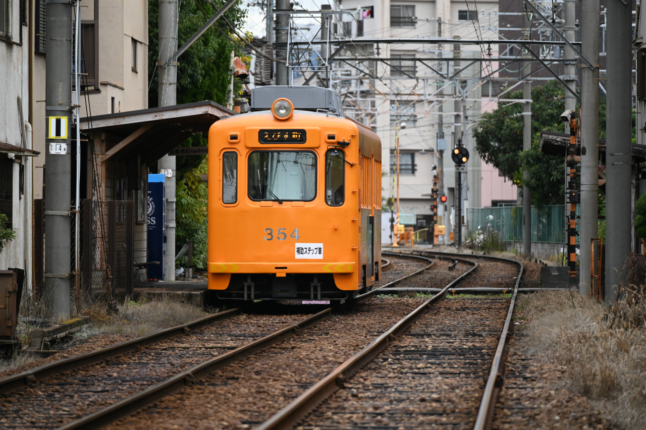 1989年東急車輌(現総合車両製作所)製。恵美須町駅はかっては3面3線を持つターミナルでしたが、2020年に100m南に移転し1面1線の小規模な終端電停になっています。