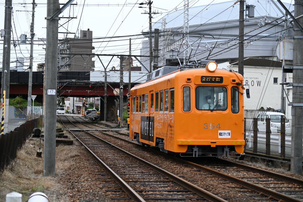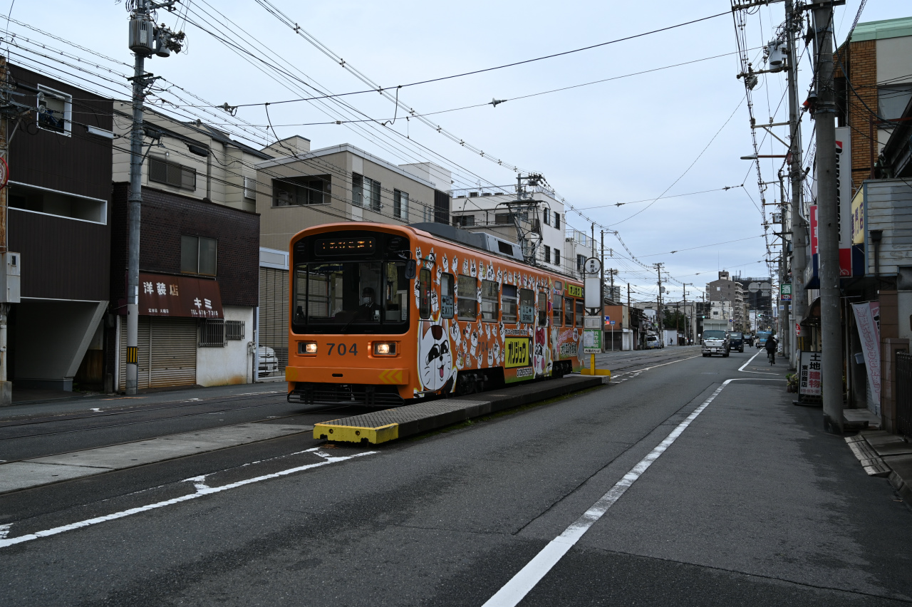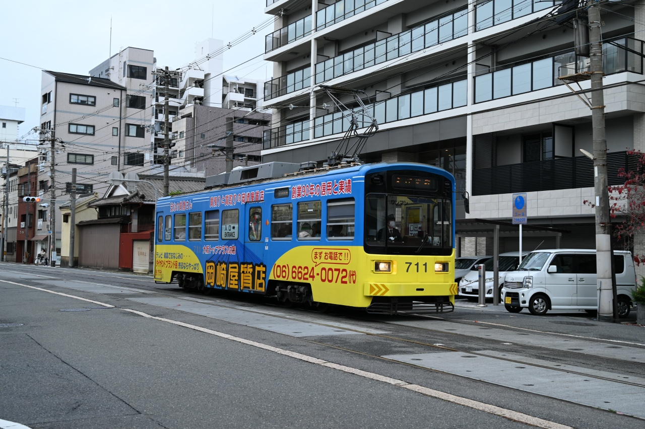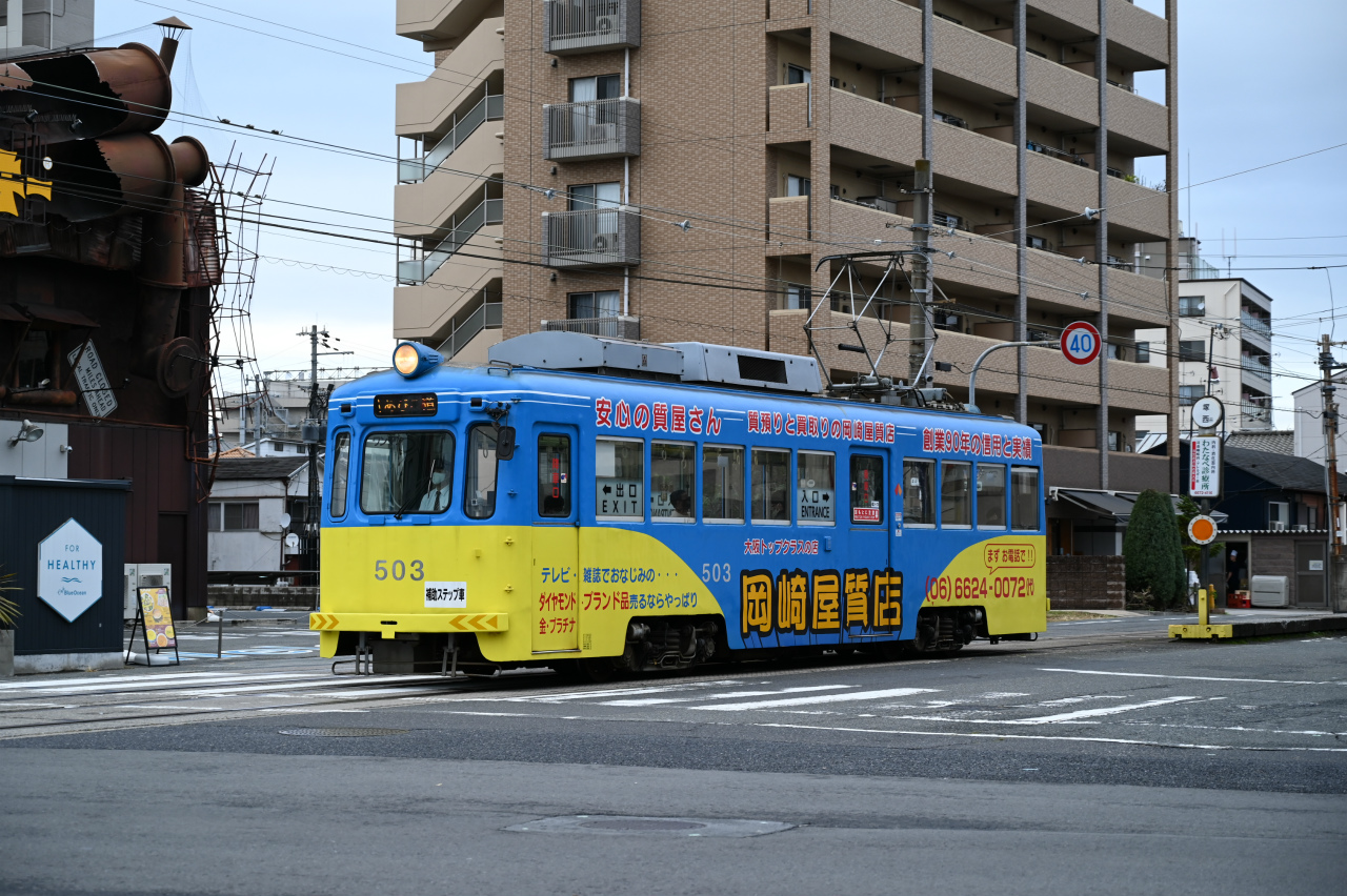 1989年東急車輌(現総合車両製作所)製。恵美須町駅はかっては3面3線を持つターミナルでしたが、2020年に100m南に移転し1面1線の小規模な終端電停になっています。
