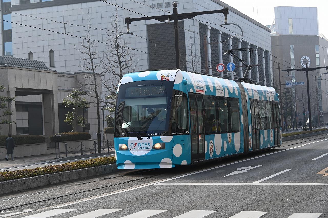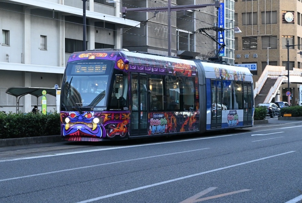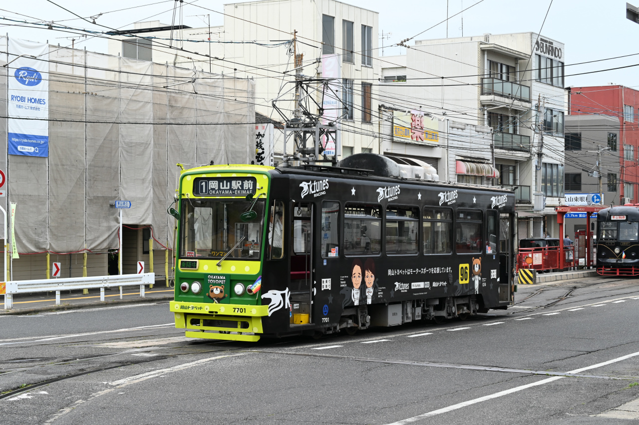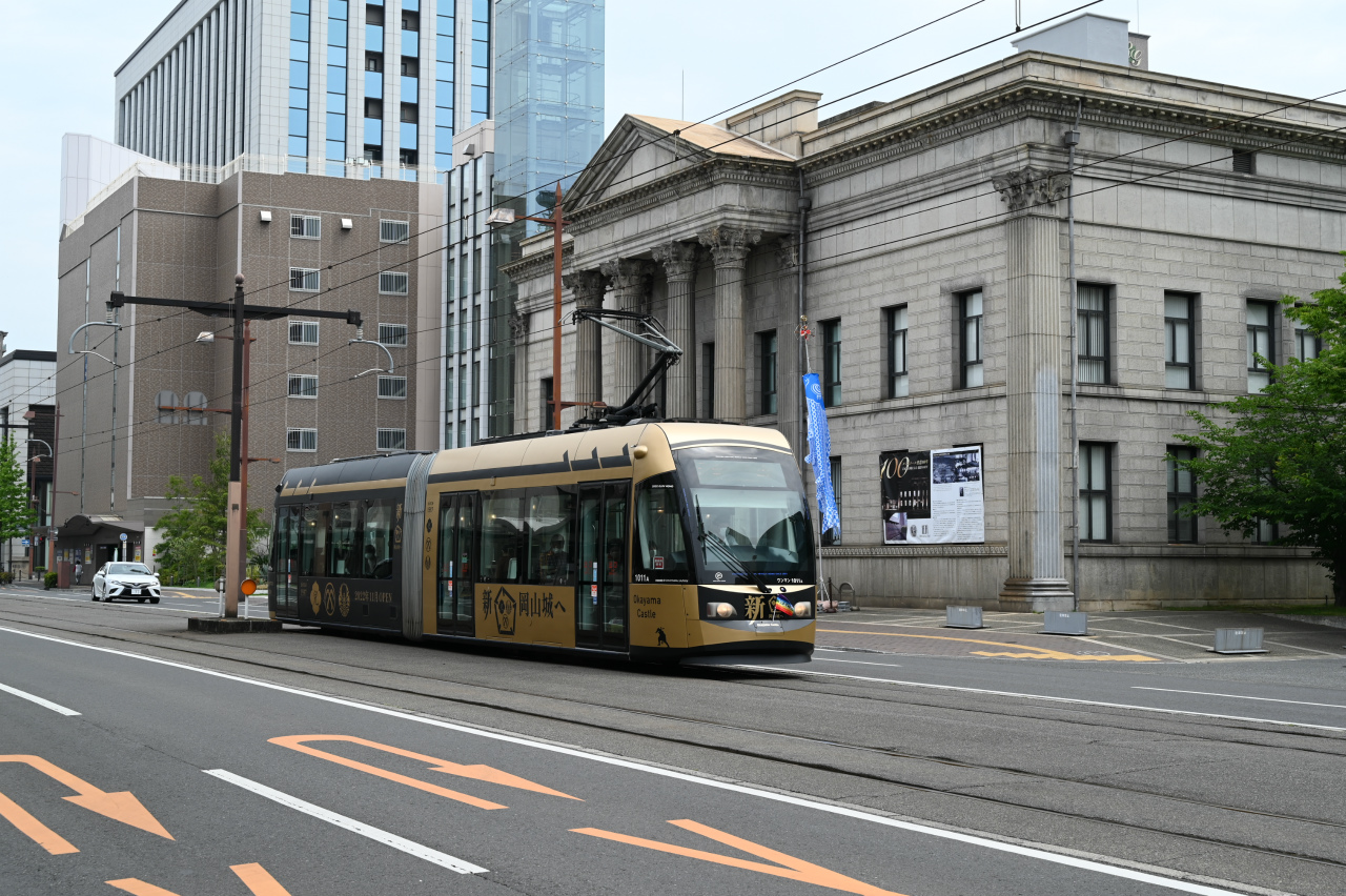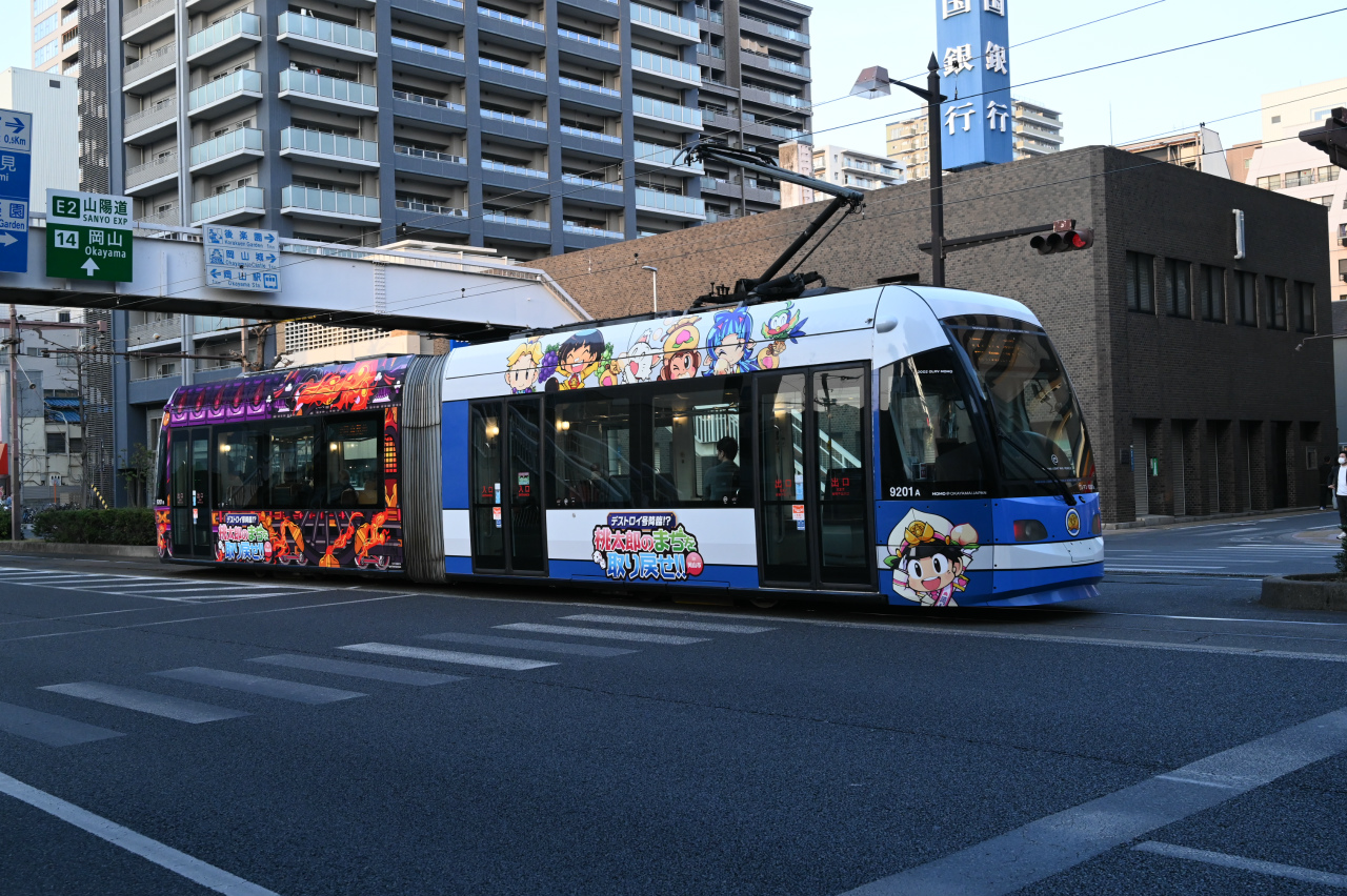 2010年に岡山電気軌道100周年記念として導入された、新潟トランシス製の9200形第2編成「MOMO2」。100年を越え、上3桁が創業からの年数になった様です。