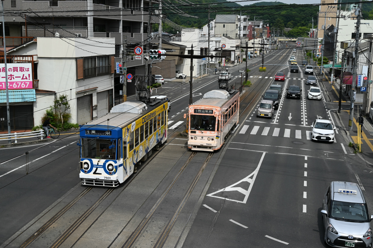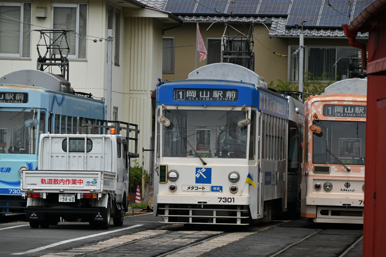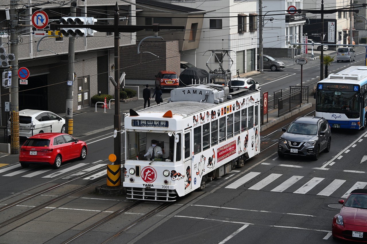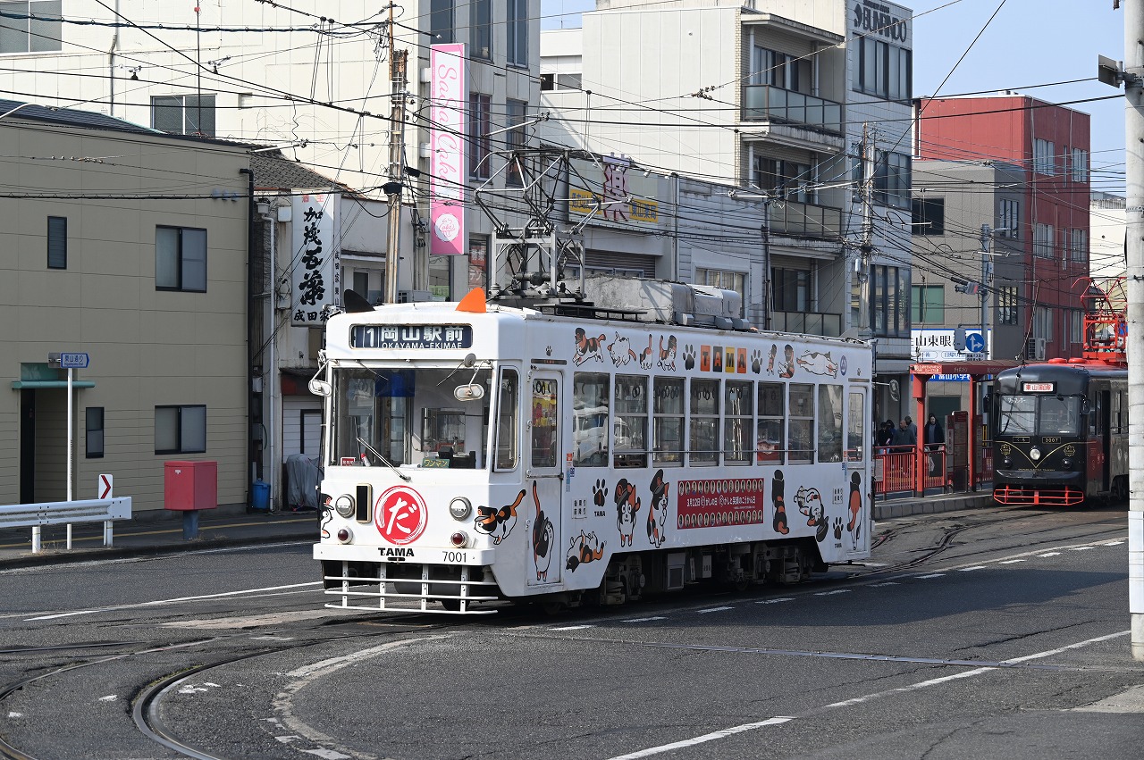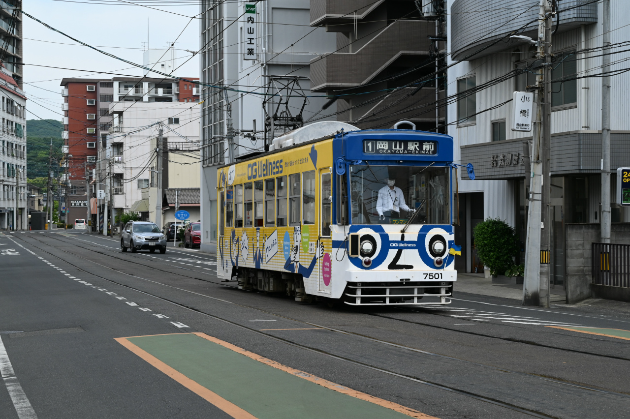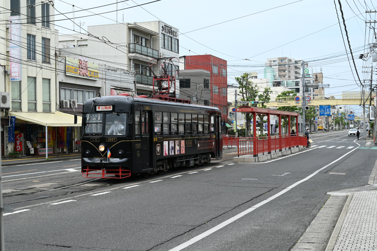 1984年以来38年ぶりの撮影です。最新鋭の超低床車も導入されていますが、主力は旧型車の機器を流用した車両で、「石津式」パンタグラフも健在です。元東武日光軌道線の3000形も2両健在。2019年からは「チャギントン」電車も導入されています。 また、延長4.6㎞の日本一短い路面電車ですが、岡山駅へ乗り入れの他、路線延長の計画もあるようです。ここの車両の付番は、上2桁が会社創業年(1910年)からの竣工年までの年数を表しています。特に近年は同じ形式を何年か経って増備することがあるため、形式と付番が一致しない車両が増えています。
