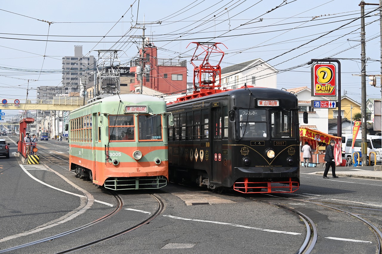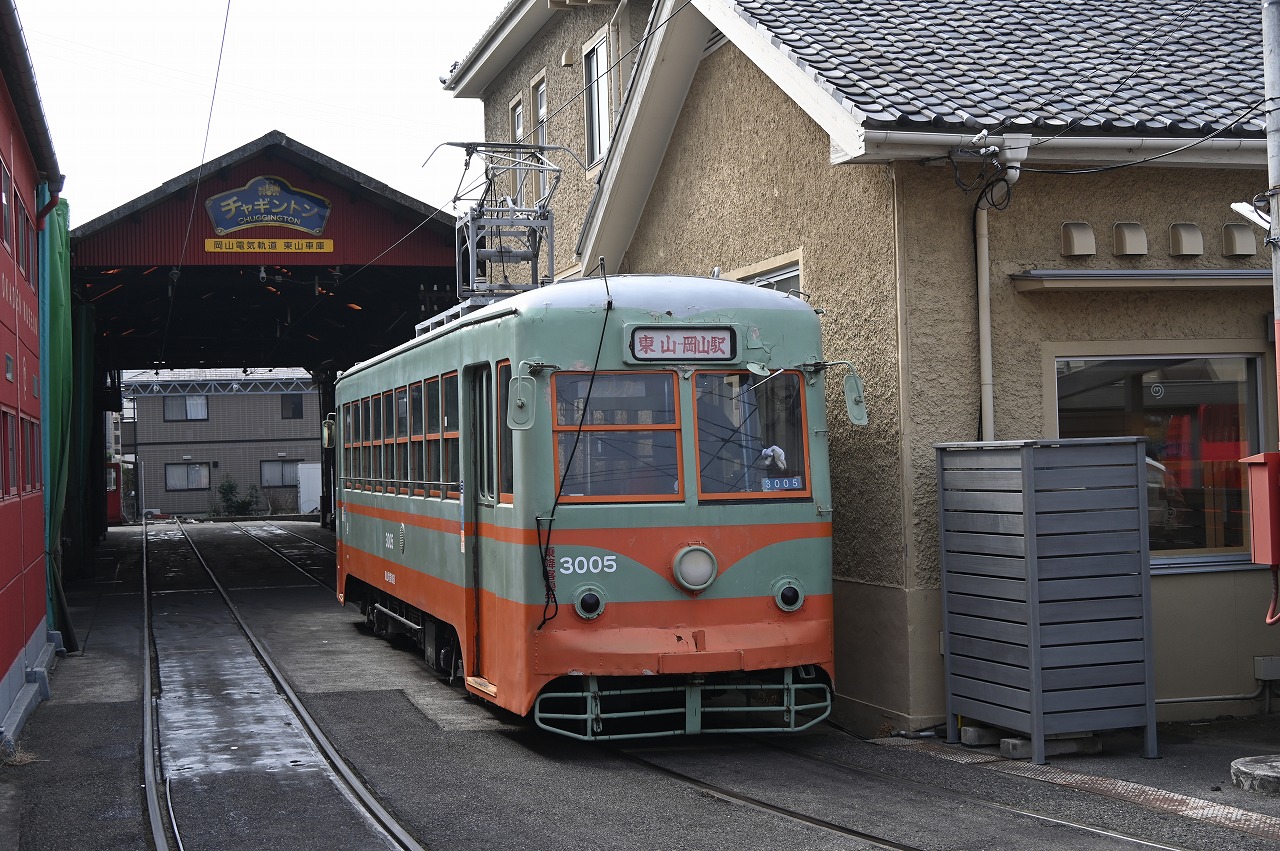 1953年宇都宮車両製の元東武鉄道日光軌道線の100形。10両製造され、1968年に日光軌道線が廃止されると、10両とも岡山電気軌道に譲渡されました。うち、5両が7900形に機器を譲り廃車。1両が事故廃車となり、残った4両のうち、3009と3010が栃木県に里帰りし、3010は東武日光駅前で保存されています。3005と3009は運用は限定されていますが2025年現在現役です。