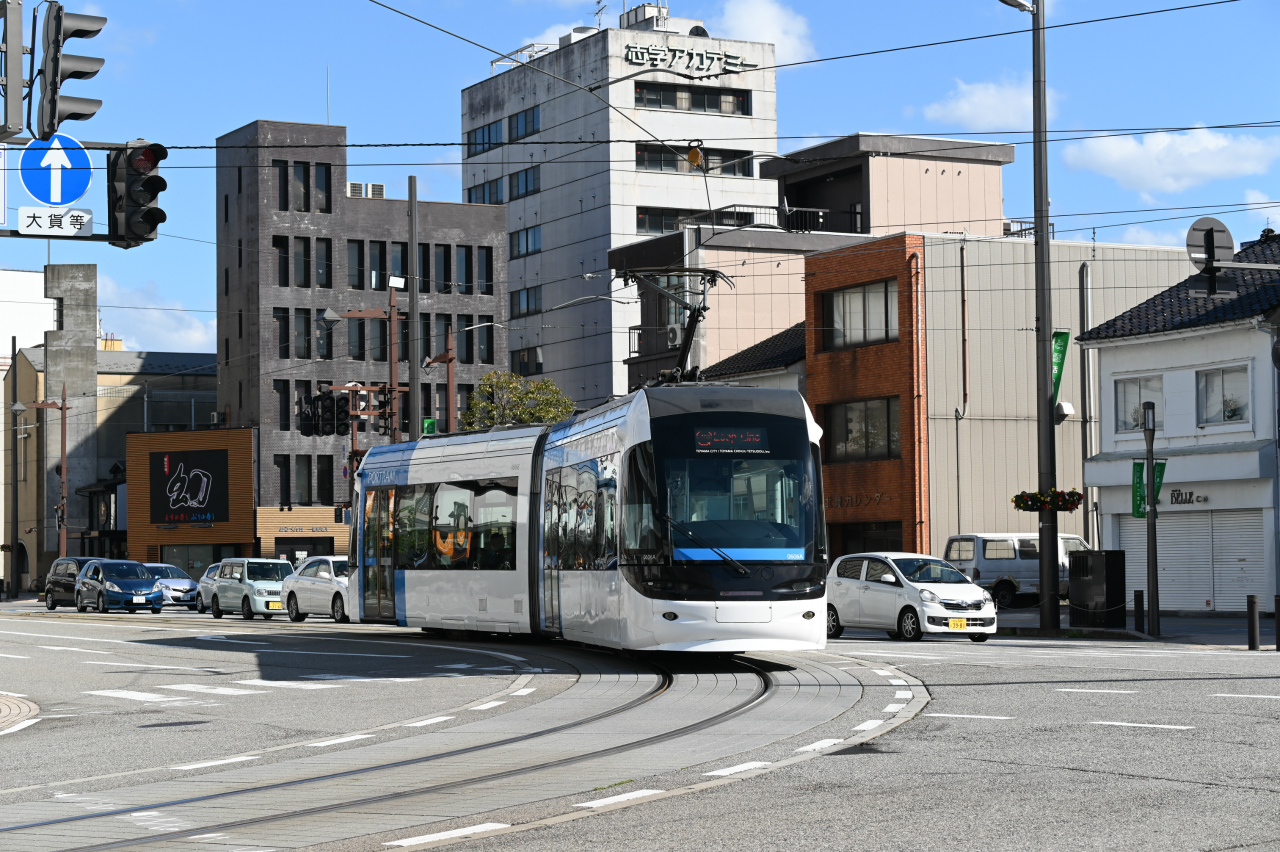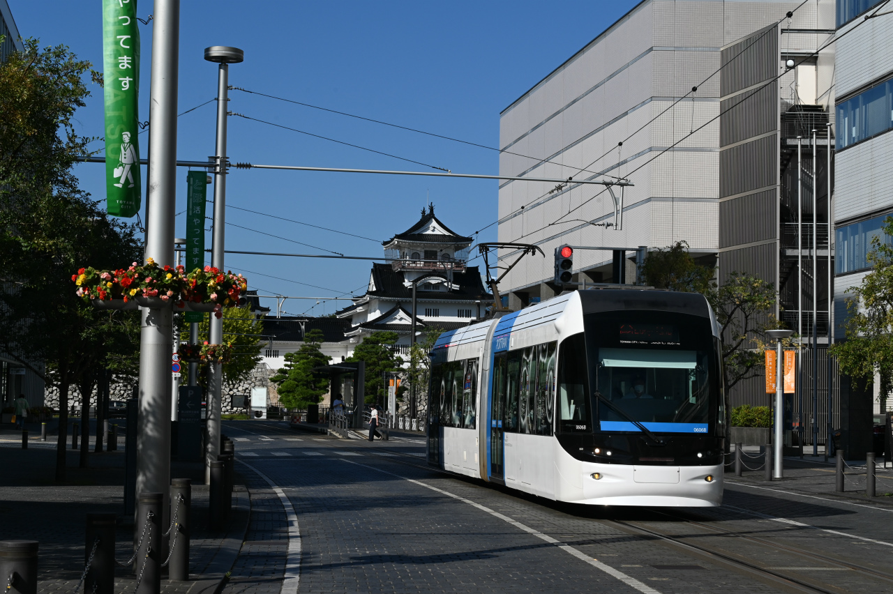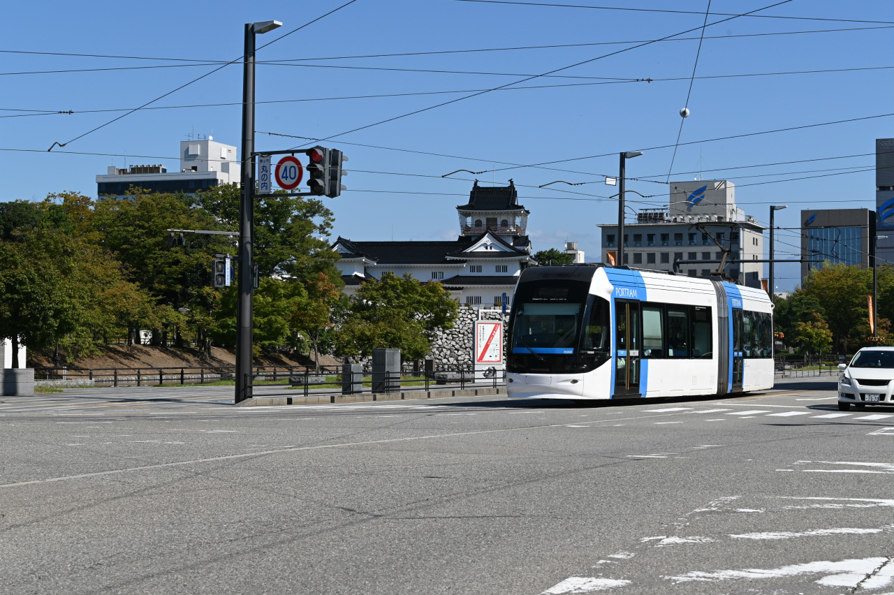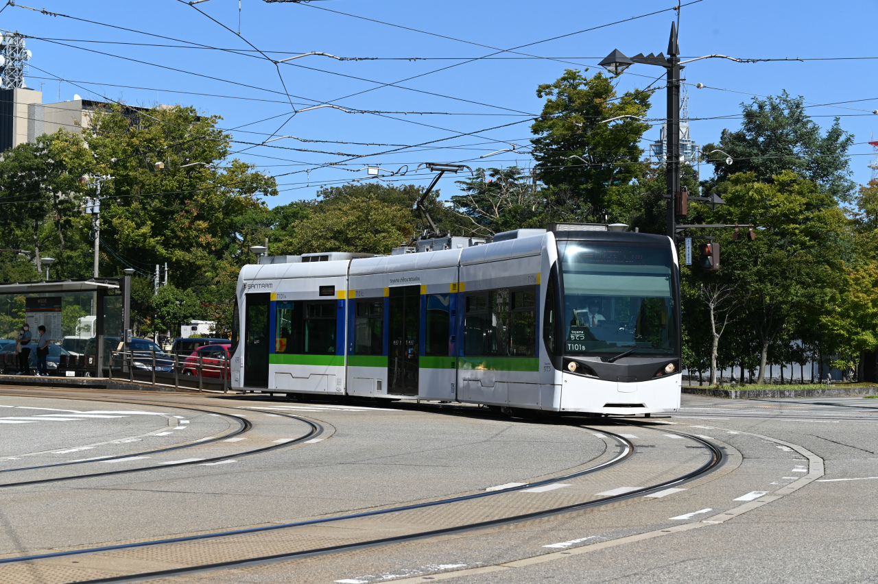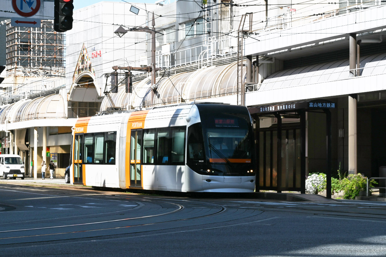 2006年新潟トランシス製のLRV、富山ライトレールに導入された「ポートラム」。2020年合併時に富山地鉄に移籍。同系車にデ9000形「セントラム」、 万葉線MLRV1000形、熊本市電0800形、岡山電軌9200形、えちぜん鉄道L形、 3車体の福井鉄道F1000形、宇都宮ライトレールHU300形があります。環状線に入っていきます。