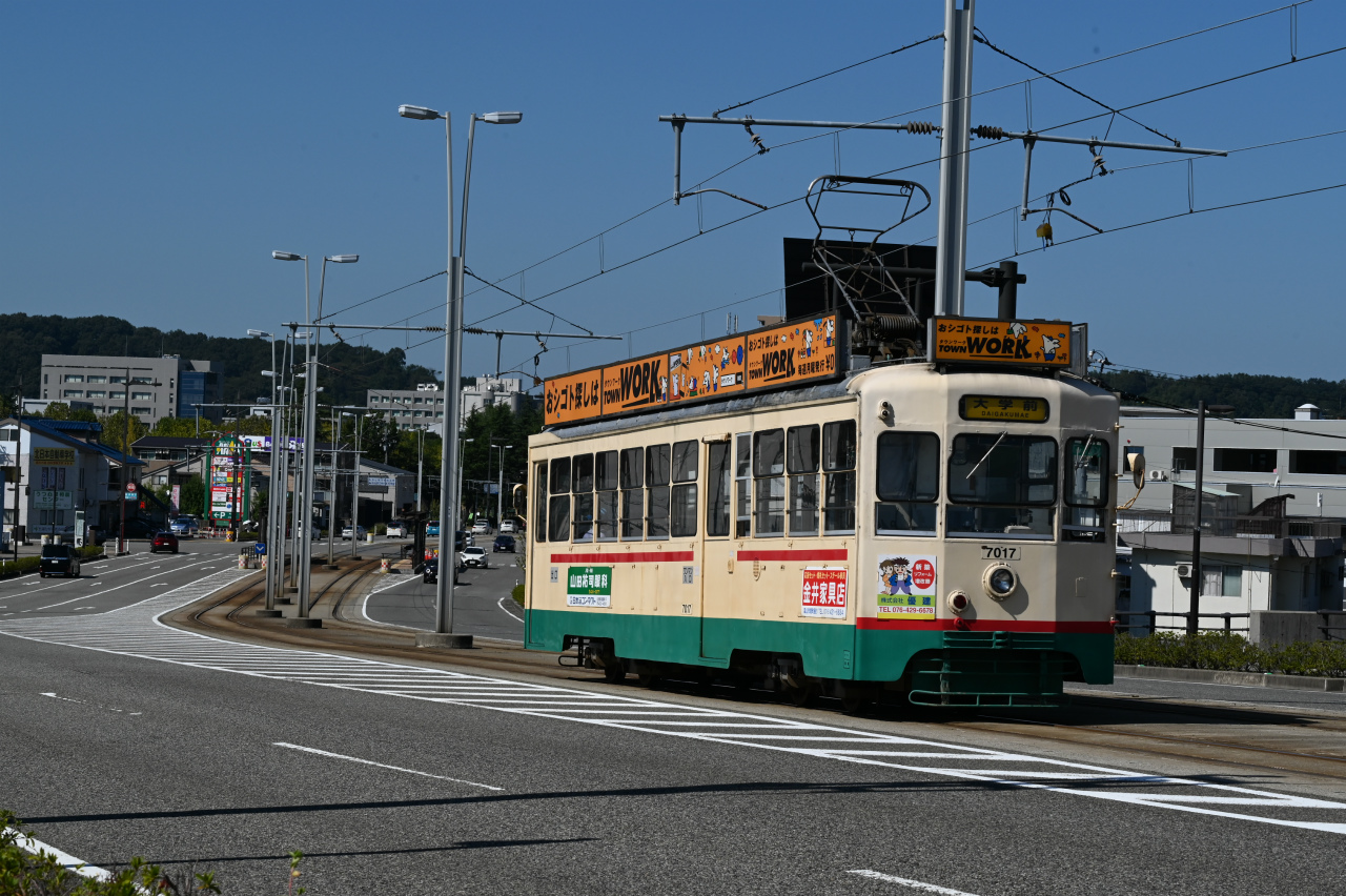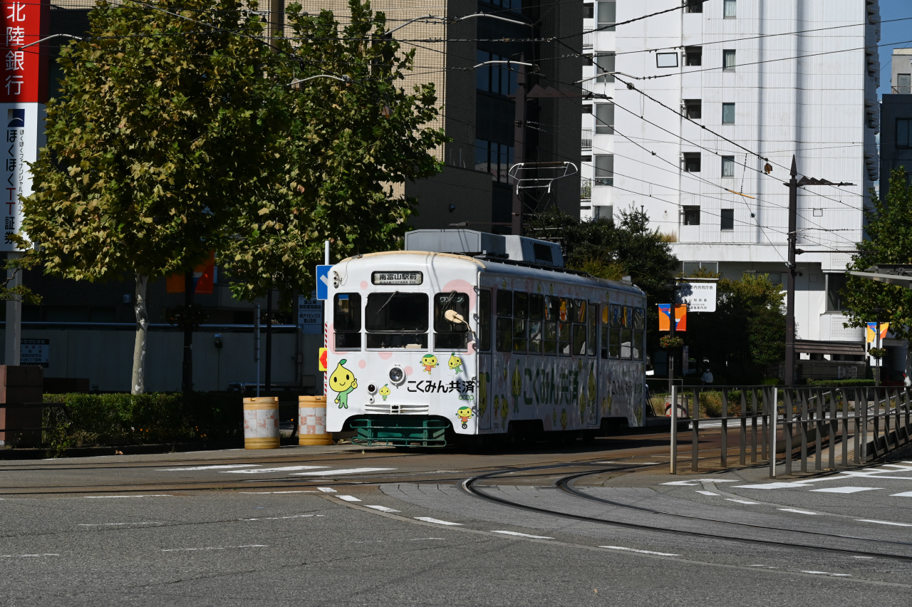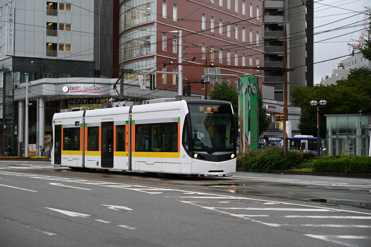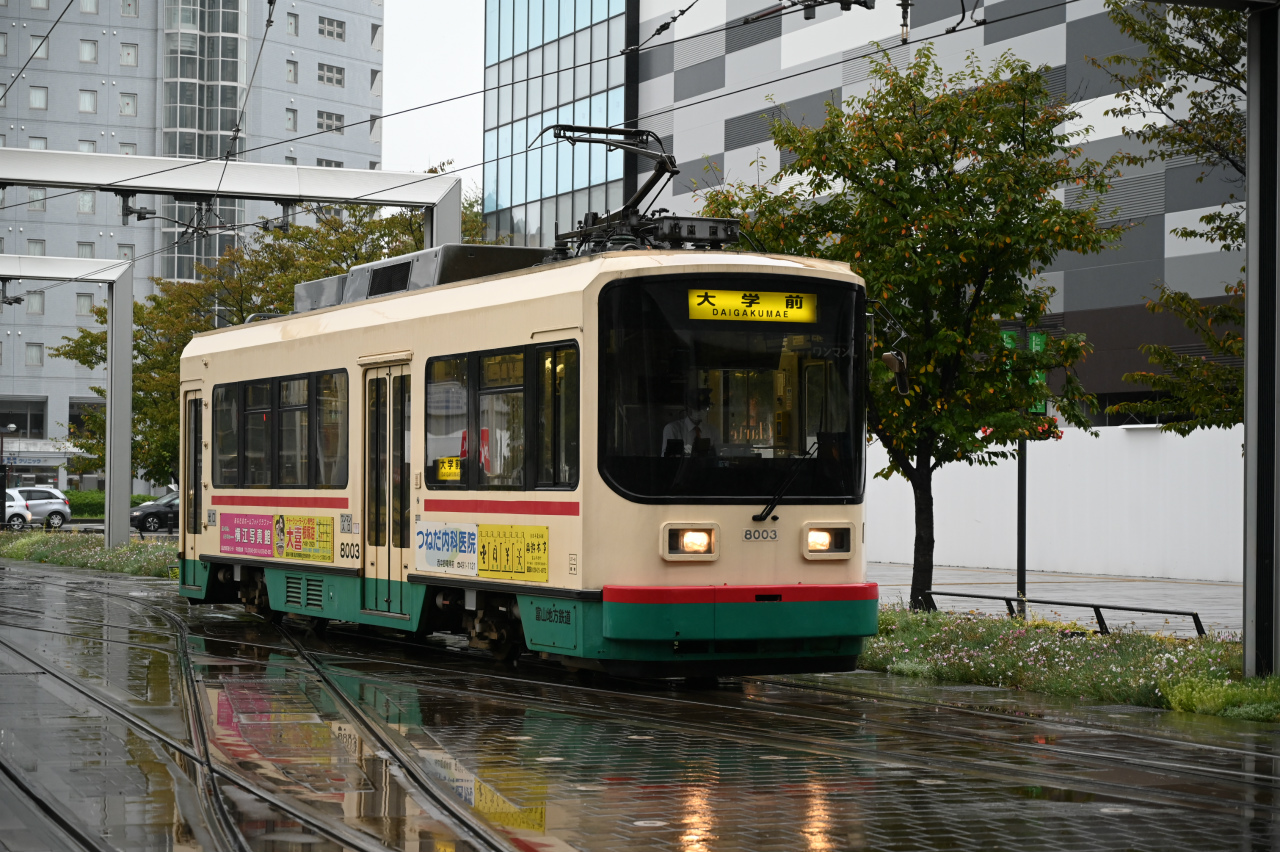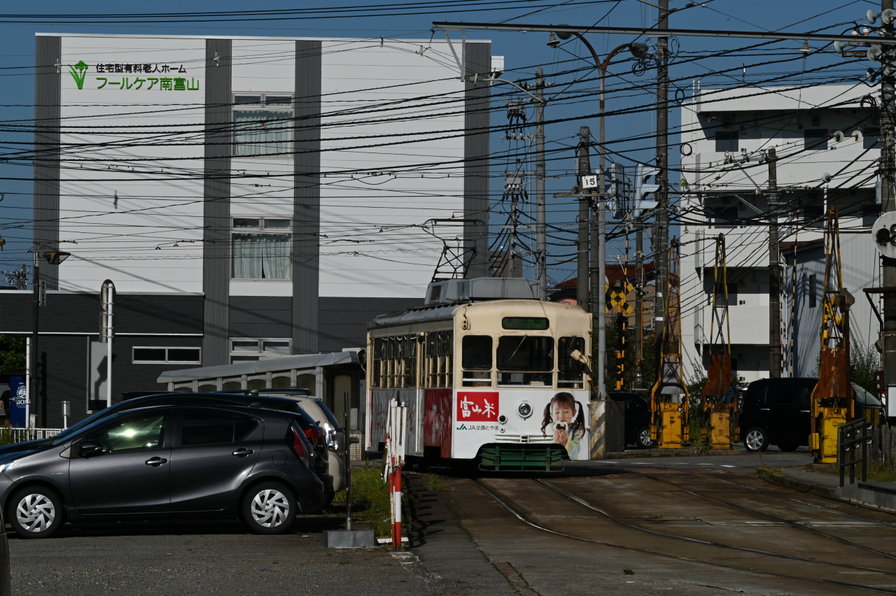 2006年新潟トランシス製のLRV、富山ライトレールに導入された「ポートラム」。2020年合併時に富山地鉄に移籍。同系車にデ9000形「セントラム」、 万葉線MLRV1000形、熊本市電0800形、岡山電軌9200形、えちぜん鉄道L形、 3車体の福井鉄道F1000形、宇都宮ライトレールHU300形があります。環状線に入っていきます。