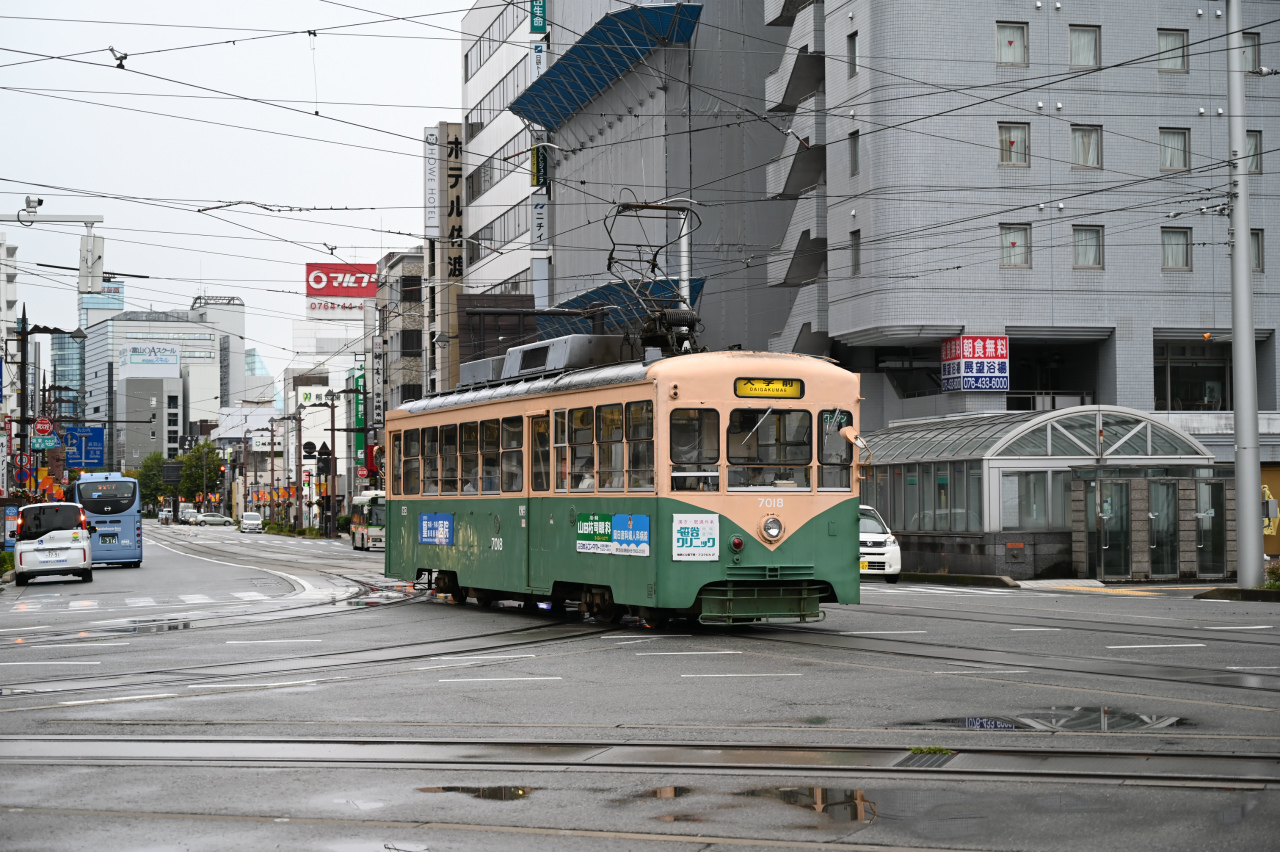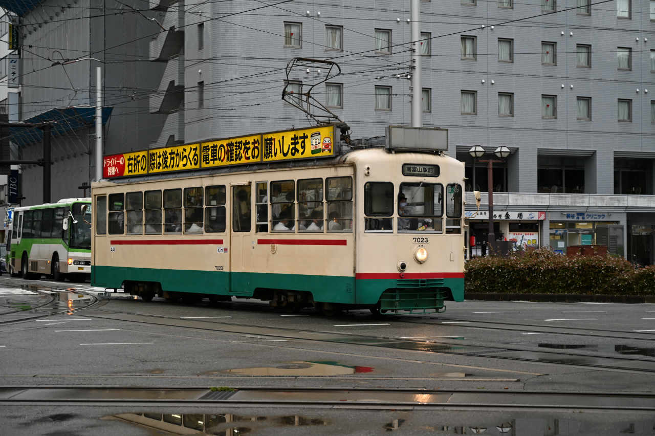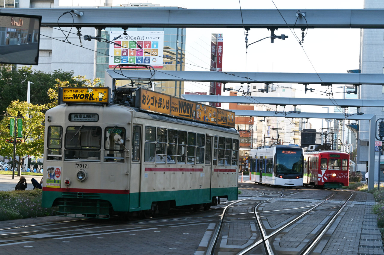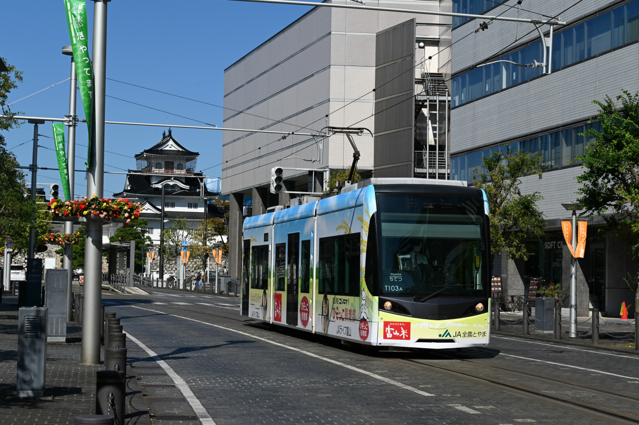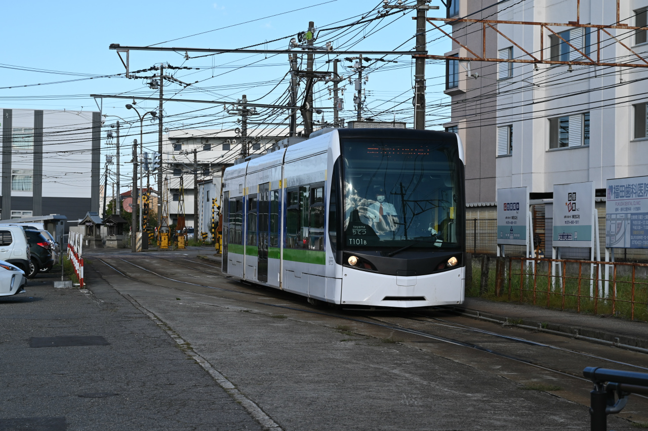 2015年アルナ車両製。T100形は2011年より導入されている2台車3車体の超低床車(リトルダンサータイプUa)。愛称は「サントラム」。豊橋鉄道T1000「ほっトラム」 札幌市電A1200「ポラリス」 とさでん交通3000形 阪堺電車1001形 長崎電気軌道5000形 筑豊電鉄5000形は同系車です。