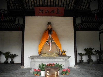 盤門を築いた伍子胥を祭る廟と伍子胥像。伍子胥は春秋戦国時代に呉王闔閭と、その子夫差に仕え、越と戦いました。 最後は越の軍師范蠡の策に嵌った夫差により自殺を命じられます。「死者に鞭打つ」「日暮れて途遠し」の故事で有名です。