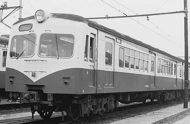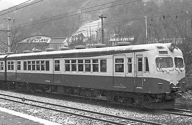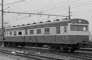 クハ77形80系のサロ85形で、横須賀線用に転用されていたうちの6両を昭和43年に格下げ、3扉化・運転台付きに改造したものです。新前橋区に配置され両毛線・吾妻線用として使用されました。後部扉はサロ時代のまま70センチ幅でデッキ付きです。 |