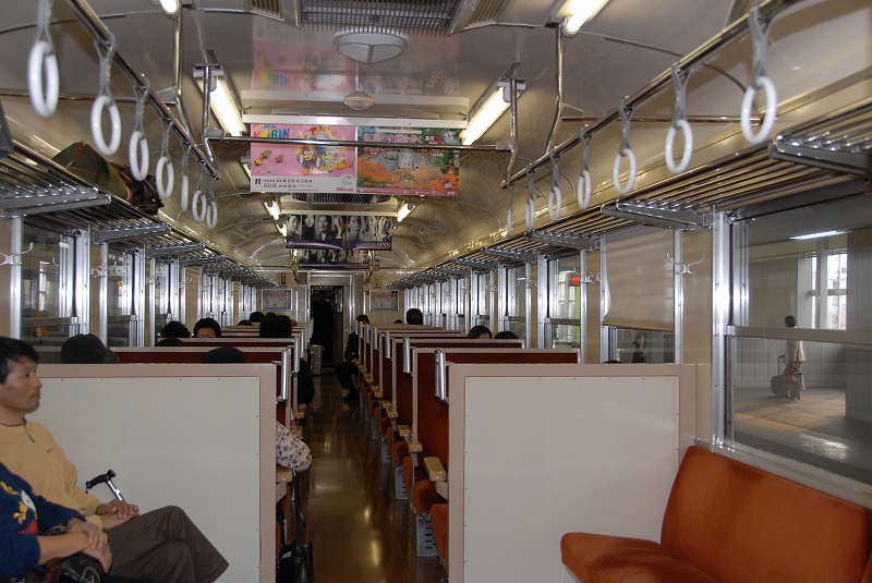 ロング席端部は板で背当てなし。デッキに窓あり貫通扉はなし