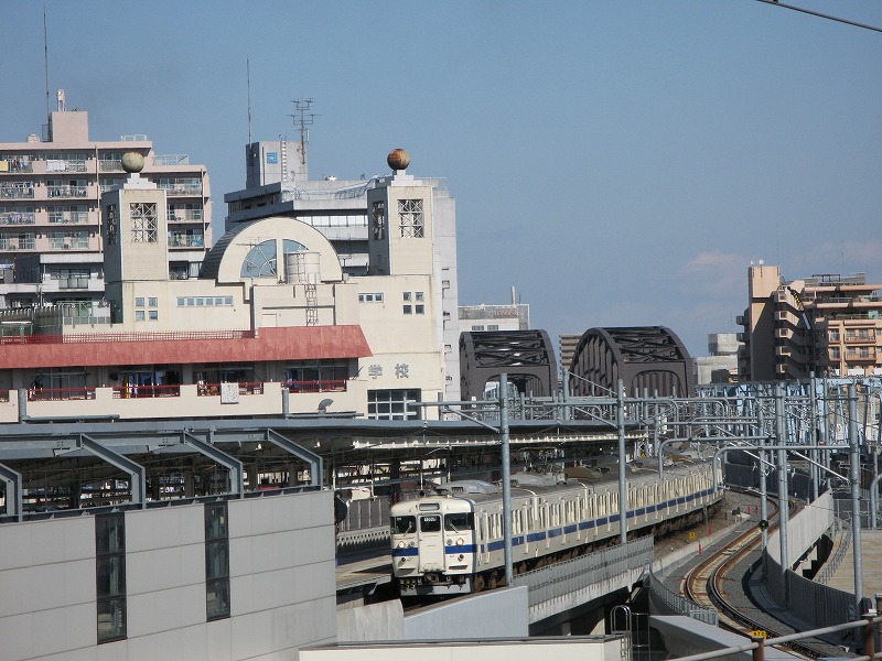 勝田電車区の脇を行く下り列車