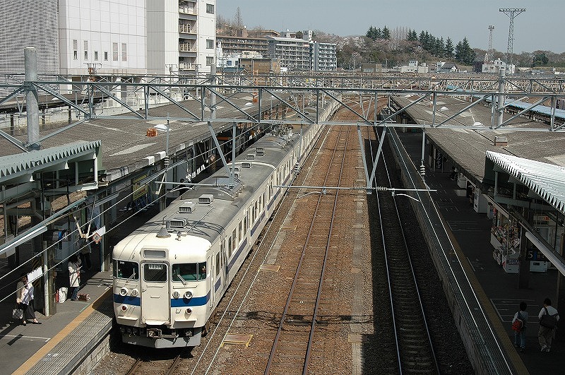 下りホーム。勝田止まりの415系普通と勝田以北に行く始発455系の普通は同一ホームで乗り換えられた