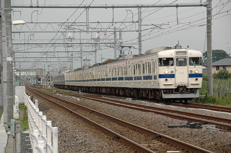 流鉄5000系の脇をすり抜ける415系の2階建て普通車を先頭にしたK880編成